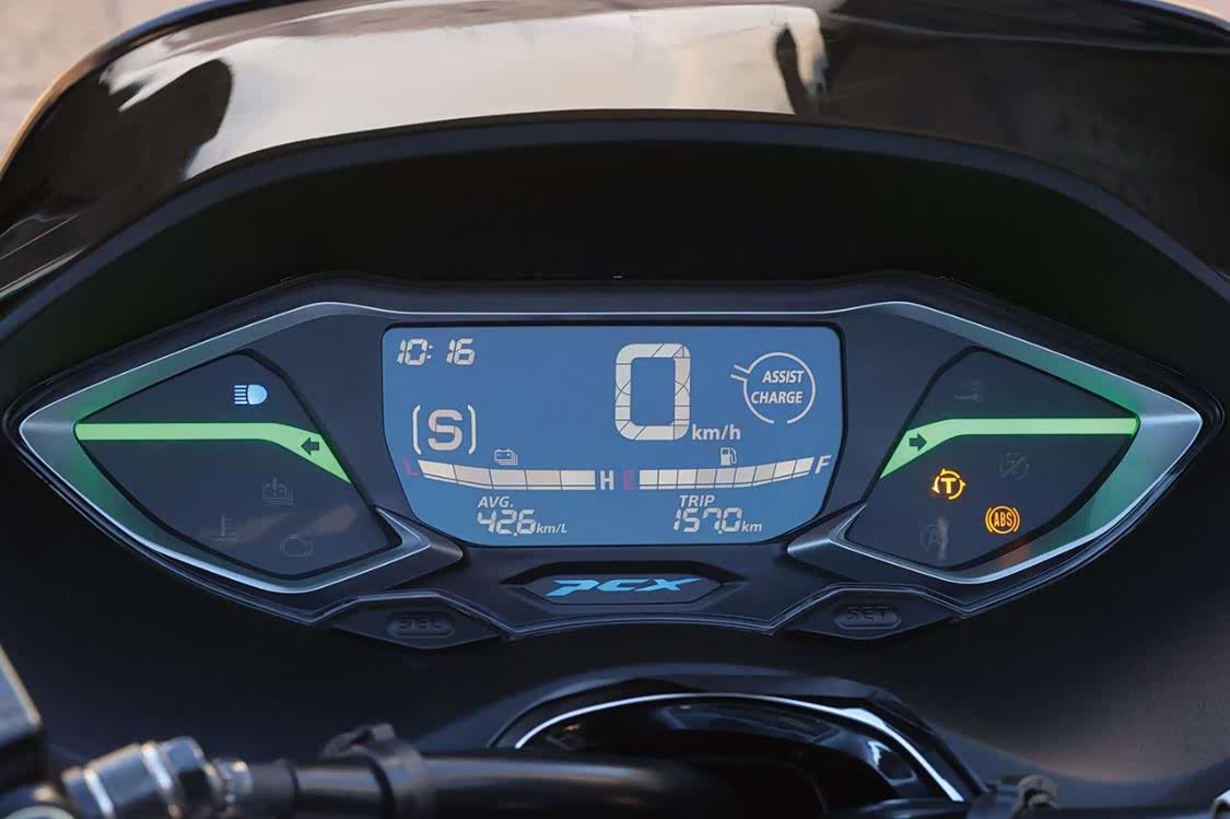仪表使用了负光液晶仪表,基本与PCX的汽油车型相同,从仪表上我们能够看到它的平均油耗,每升油可行驶42.6km,约2.34L/100km,作为一辆试驾车来说,这个油耗也相当不错了。右上角还能看到电机辅助的工作状态。