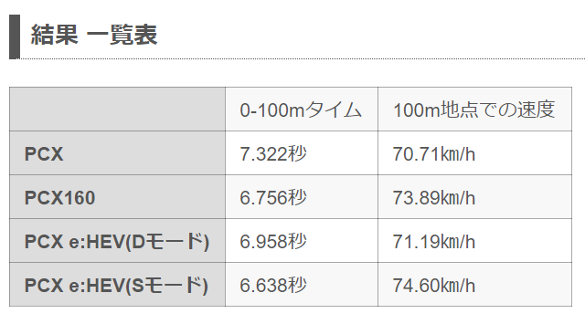 日本媒体也对PCX和新款PCX160以及PCX e:HEV进行了加速对比测试(日文很简单就不再翻译),PCX e:HEV以124cc的排量赢得略微超过156cc排量的PCX160的加速成绩,可见它的混动系统还是颇为成功的。