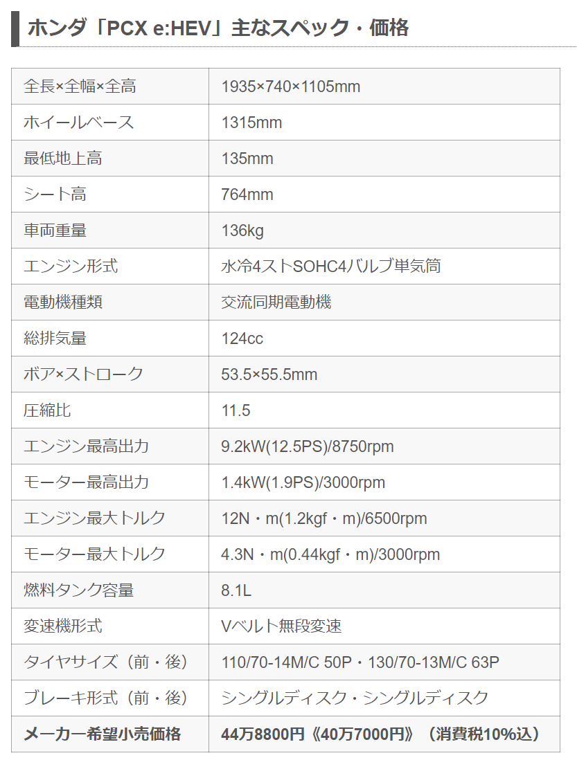 PCX e:HEV的规格表与售价,由于汉字较多就不再一一翻译,44.88万日元的含税售价约合人民币2.74万元,如果是含税价格似乎也并不太贵。混合动力车型能够用更小的排量实现更强的动力,更平顺的驾驶体验,如果价格相差不多你会接受么?不知道中国的摩托车企业是否有混合动力方面的研究,在新能源汽车如火如荼的时候,摩托车能否凭借混合动力来弯道超车呢?希望可以吧。