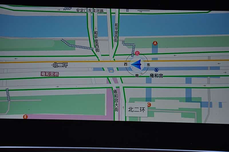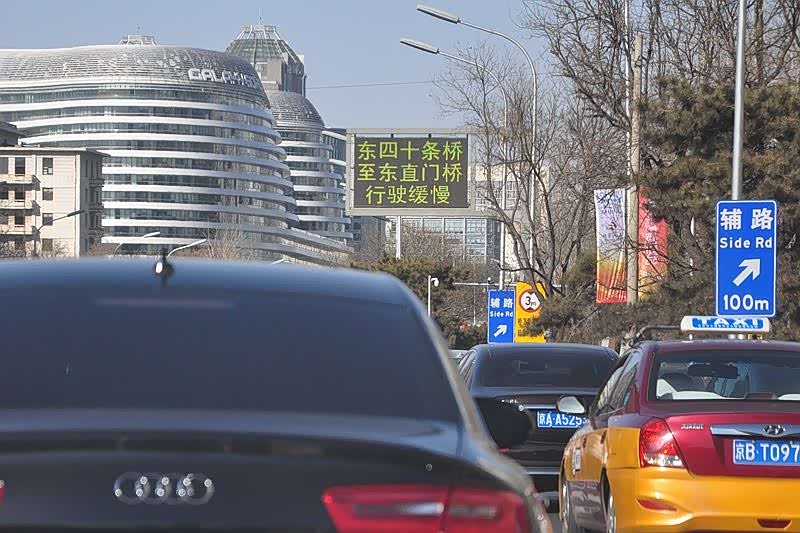 玉蜓桥之后,车速又慢了下来,但基本上还能保持30公里左右的时速。过广渠门之后,呈现出与西直门相同的拥堵。该车中控屏上有路况显示——东二环一线基本都是红色。