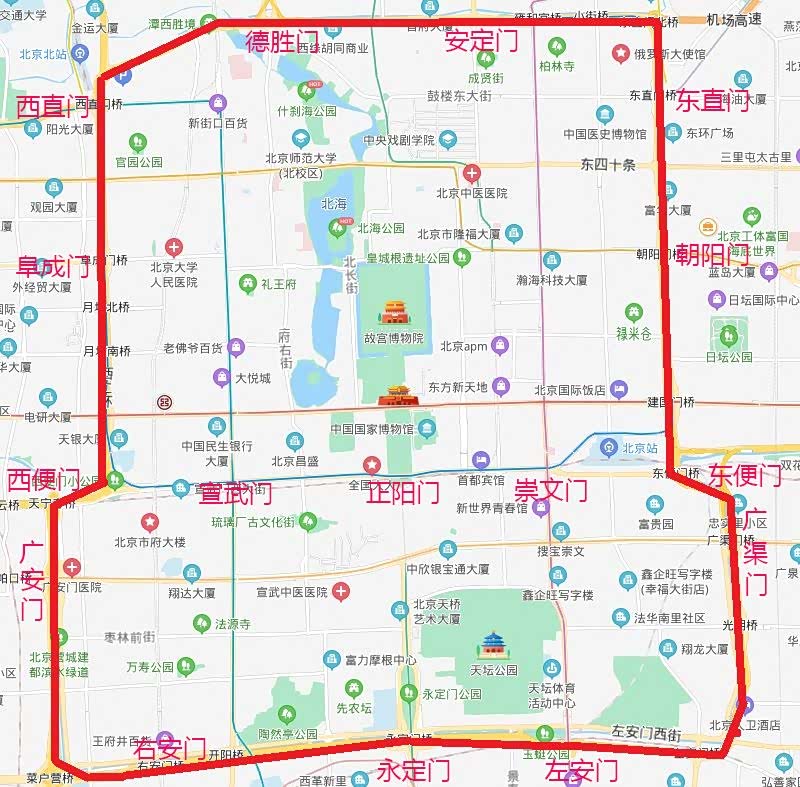从上图可以看出,二环路以外,如今也都是北京城区,可在历史上,它们全部属于郊区,唯有二环路以内,才是真正的北京城。北京城并不大,分为外城、内城、皇城与宫城。外城在南,有7座城门,内城在北,有9座城门。城墙拆除后,沿城墙修筑的环城路,称为二环路。顺便说一句,最初规划曾有一环路,沿皇城而筑。
