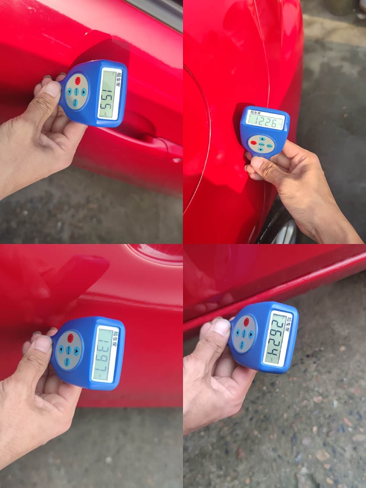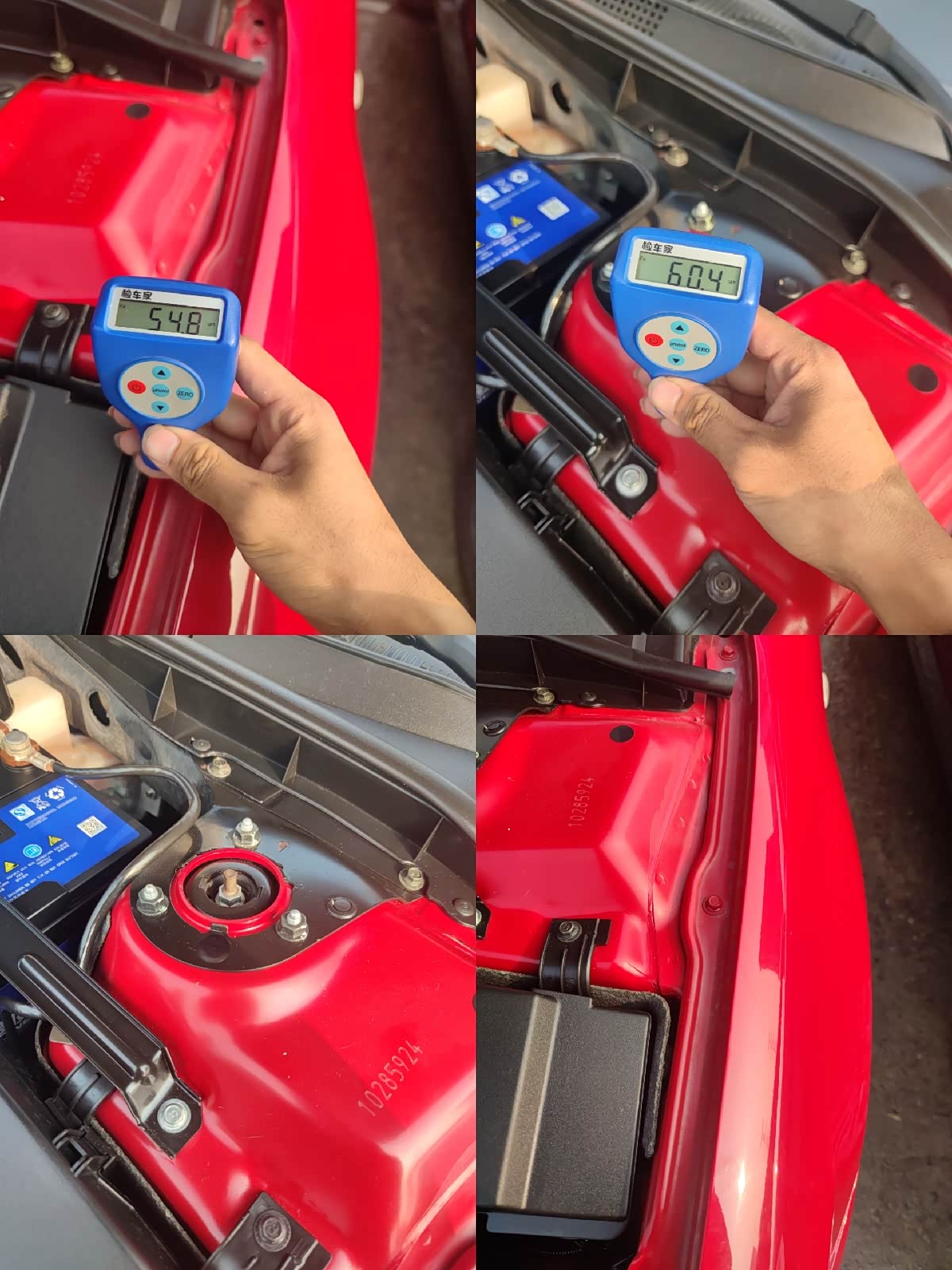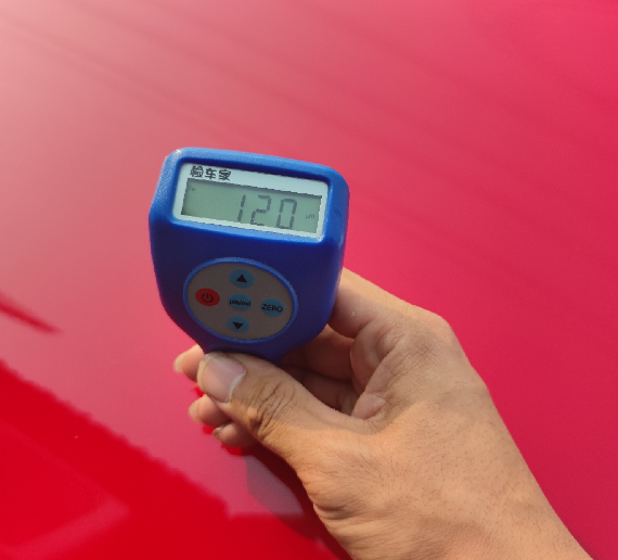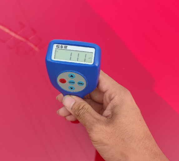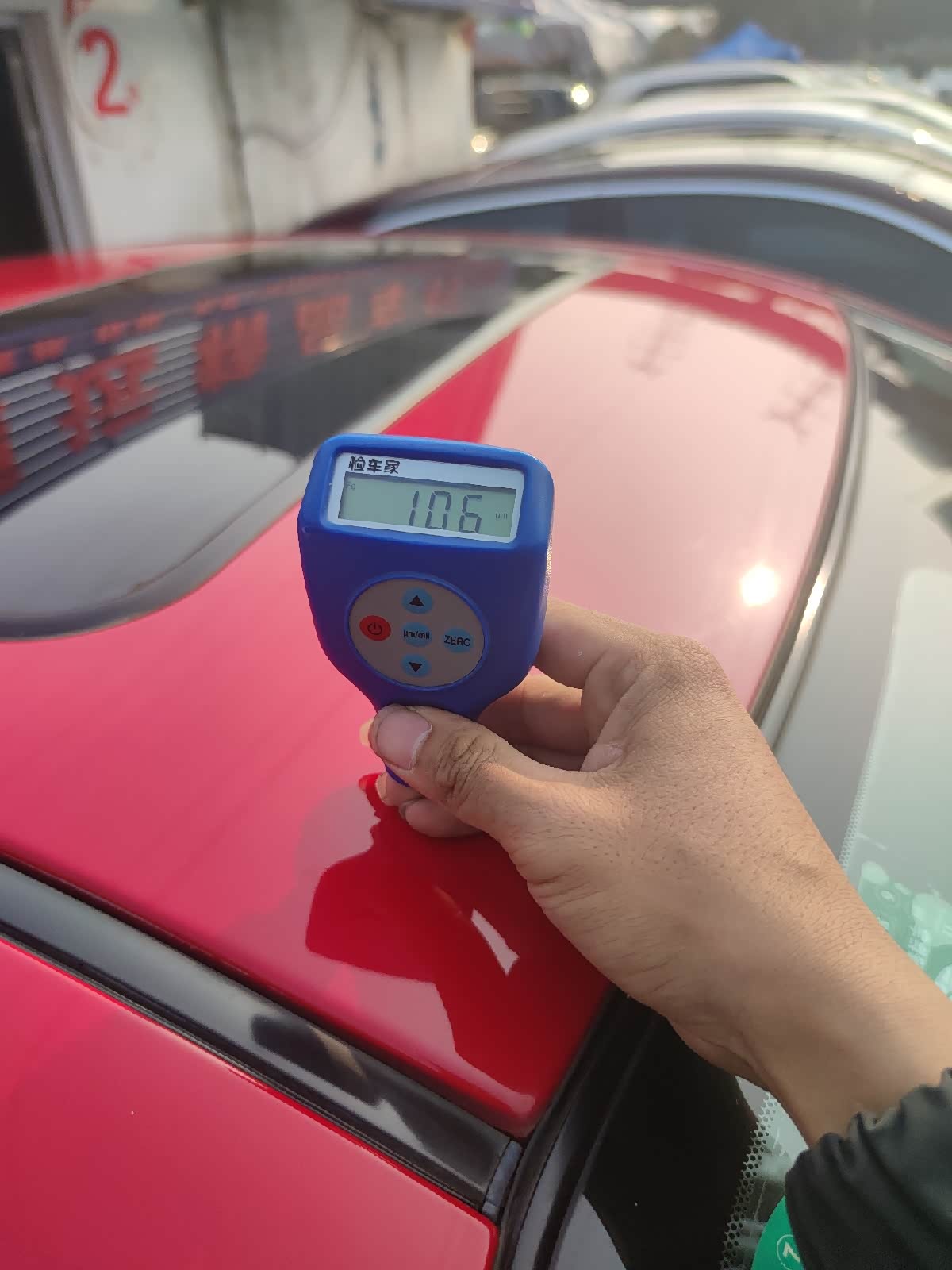 金属部分需要找一个没有喷漆的地方作为参考数值,车顶是个不错的选择,因为车顶一般是不会喷漆的,经过辅助仪器以及检测周边的情况可以判断车顶没问题。