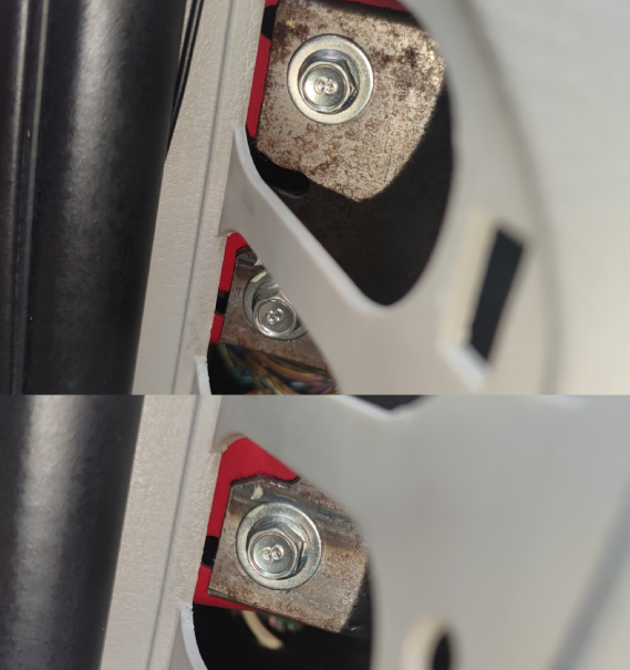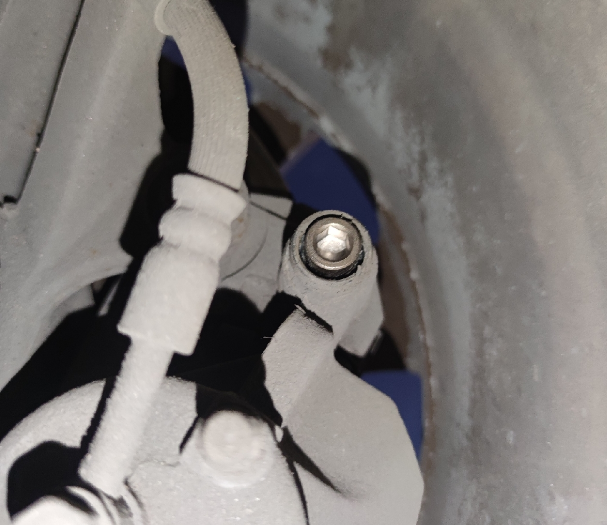 此处是前刹车分泵的固定螺丝,完全没有拆卸,如果要换刹车片,必拆它!这说明刹车片根本没有换过,再结合上面的磨损来看,也符合当前的公里数,不存在调表的嫌疑,把所有证据都摆在眼前,和客户聊了十几分钟,客户直接竖大拇指,说我说的有理有据,没有调表就好,客户心里悬着的一块大石头也落地了。