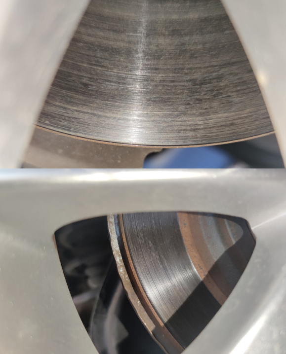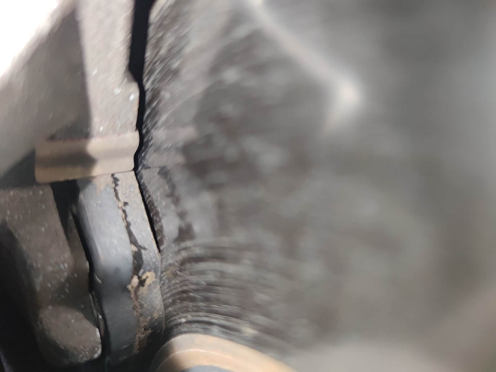 前后刹车盘对比,按理说前后磨损都应该一样,可为什么后面都磨出凹槽了呢?想了很久,想到某音一个小视频,某女子开着车忘了拉手刹,跑了20几分钟后停车发现后面刹车盘都红了哈哈哈,这个车我感觉除了拉着手刹跑,我再想不出其他理由了。