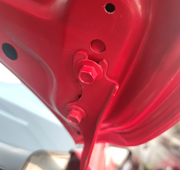此处是前盖螺丝,虽然外观检测没有发现喷漆的情况,可万一换了拆车件呢,也不是没有这种可能,经检测固定螺丝没有拆卸的情况,螺丝也不存在后期喷漆的现象,前盖正常。