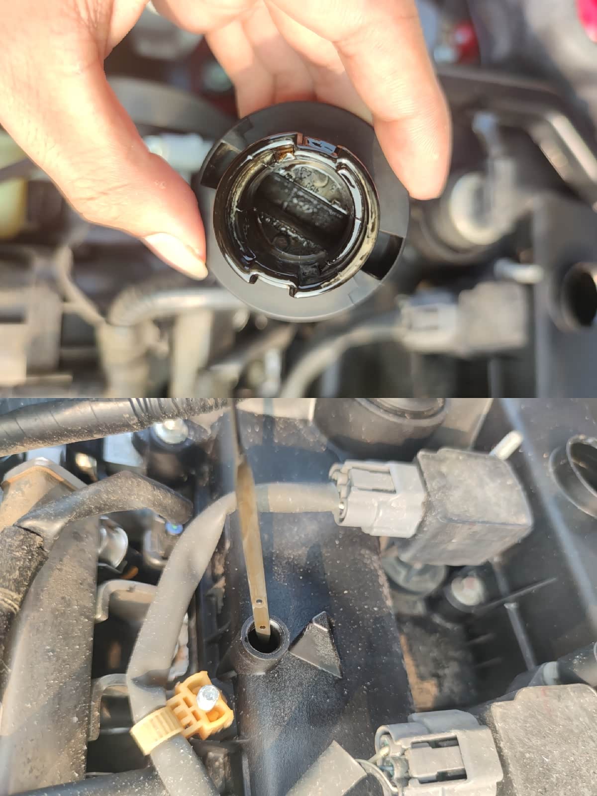 打开机油盖和机油刻度尺,发现机油脏污有些严重,回去需要立刻更换了,不然对发动机还是有影响的,马自达做个保养相对来说还是挺便宜的。