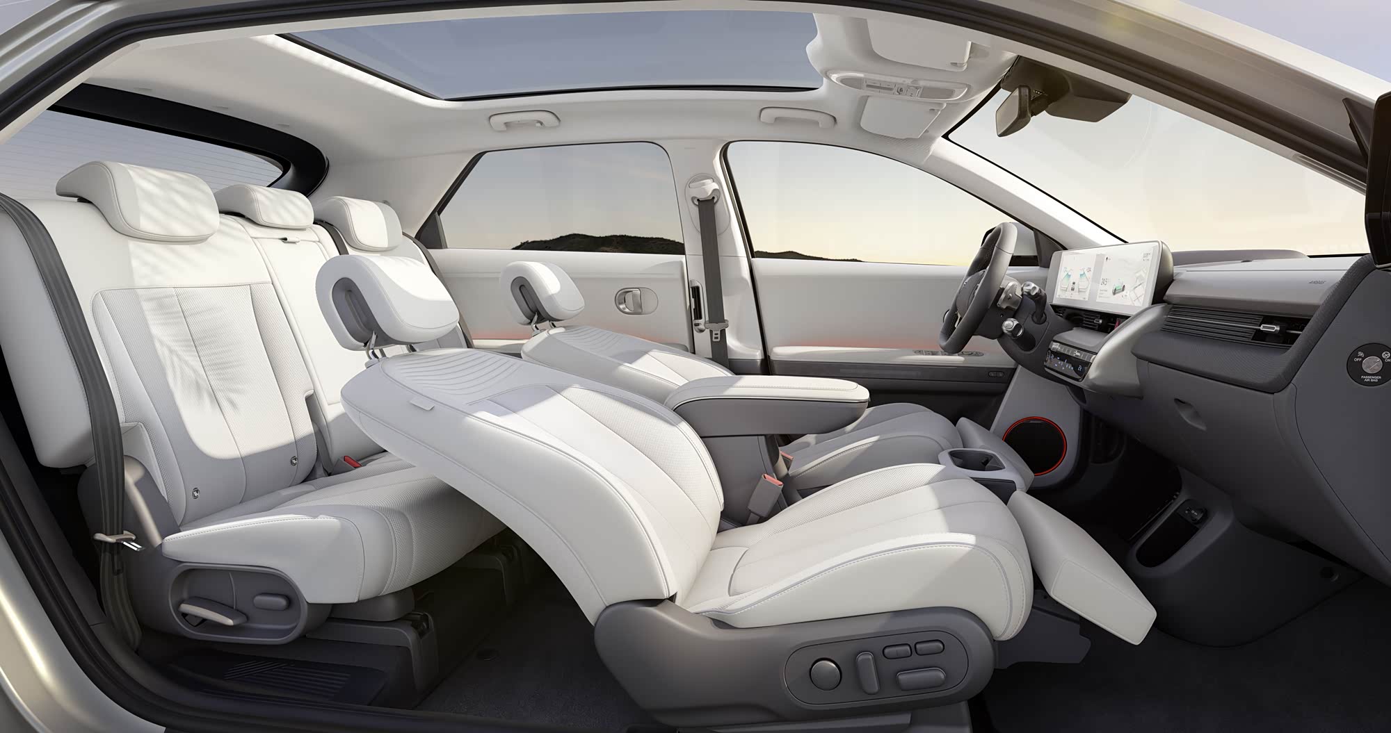 从图片中还能看出来,后排座椅采用了剧院式设计,明显比前排座椅要高,配合无遮挡的全景天窗,能够为后排乘客带来更好的视野。若是选装太阳能车顶,还可以为电池充电,从而提高能量效率,延长续航里程。