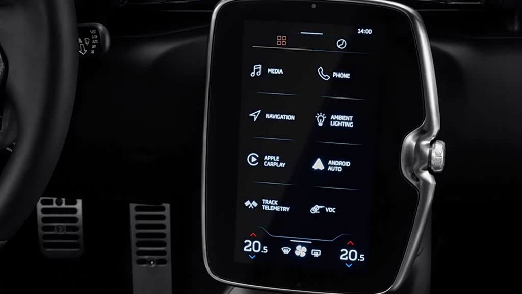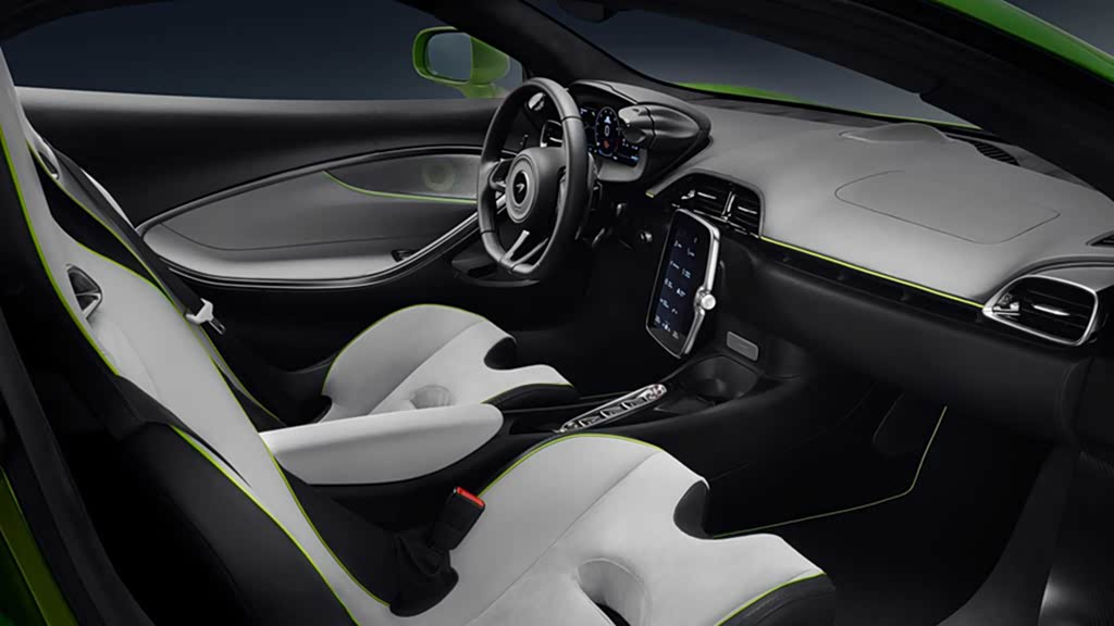 全液晶仪表盘的内部可以选择驾驶模式,仪表盘安装在转向柱上,并可以随方向盘一起转动,以进一步提高驾驶的安全性。8英寸的中控触摸屏支持导航、手机映射,如苹果CarPlay和安卓Android Auto、还可以自定义增添应用,当然语音控制必不可少。除此以外,迈凯伦赛道遥测(MTT)和可变漂移控制(VDC)等都可以通过这块液晶屏控制。