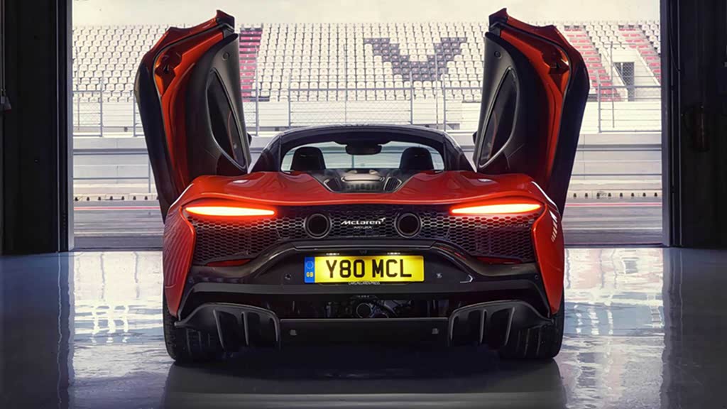 尾部的设计风格十分“迈凯伦”,“单眼皮”的尾灯组、大面积的镂空设计、高位中置双出排气以及造型夸张的后扰流板,配合上“McLaren ARTURA”的英文标识,让你魂牵梦绕,欲罢不能。