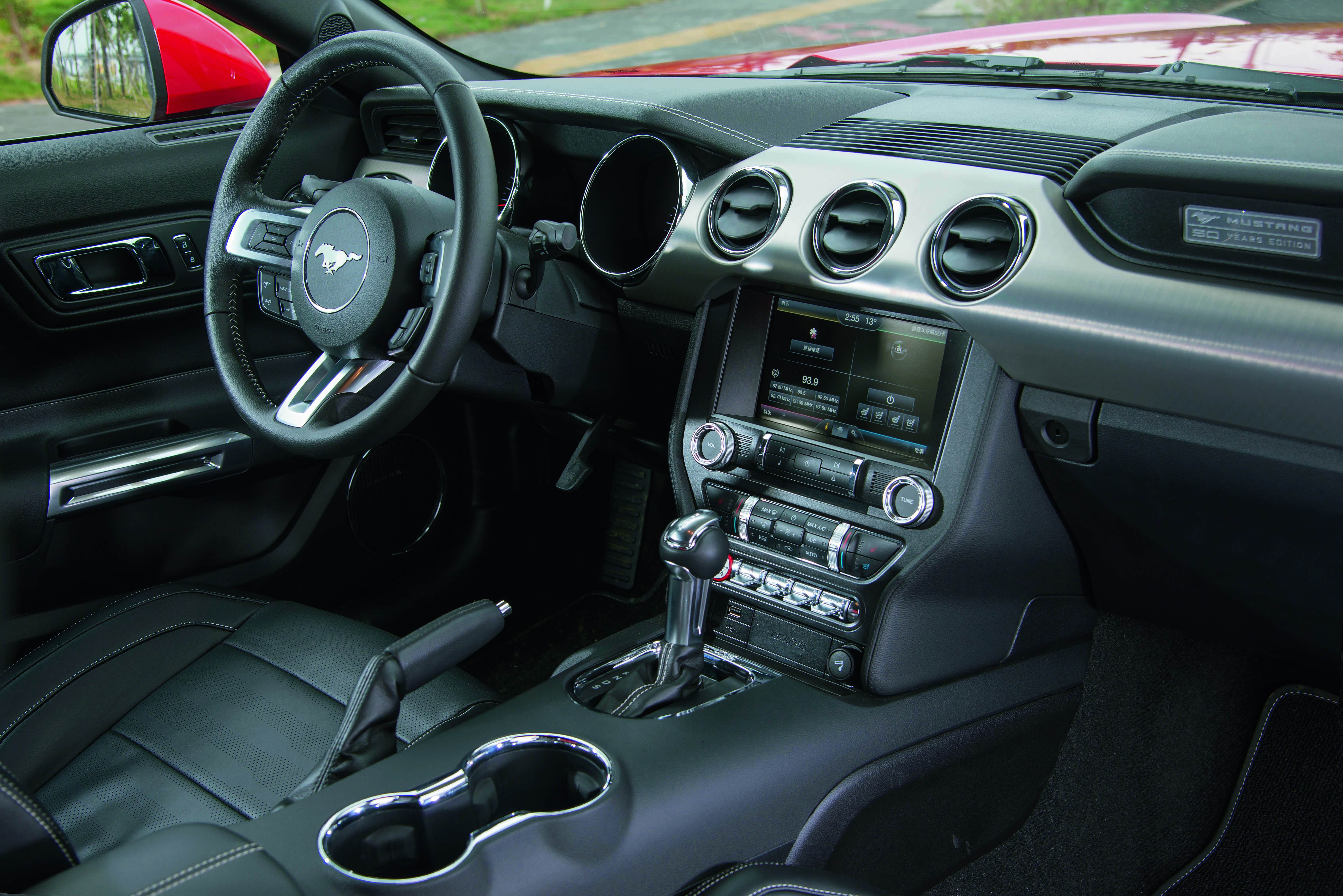 让人惊喜的是车的内饰部分,没有传统印象中的美式粗犷,有的是各种金属按键营造出的运动感。 整个布局为驾驶者营造了一种如同置身于飞机驾驶舱的感觉。这也让驾驶者所需的各种车辆信息一览无余,并且操控触手可及。全新福特野马的配置大幅提升的同时,工艺和做工也达到历代最高水准。全新福特野马的仪表显示采用了更大、显示更清晰的仪表盘,各种信息一目了然。此外,各种按键和旋钮均采用了更符合人体工程学的设计。通过增加车身宽度以及采用全新的后悬挂系统设计,全新福特野马为车上人员提供了一个更充裕的驾乘空间。