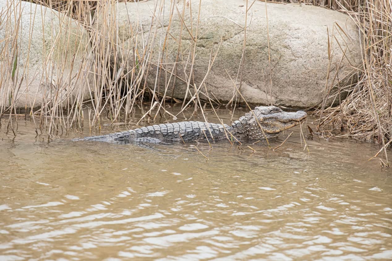 接下来发生的故事绝对能在我人生中留下浓重的一笔,我们发现了鳄鱼,品种是扬子鳄,野生的那种。事实上,扬子鳄是中国特有的一种鳄鱼,也是世界上体型最小的鳄鱼品种之一,主要分布在长江中下游地区及太湖流域,成年扬子鳄体长一般在1.5米左右,体重约为36公斤。扬子鳄十分珍稀,是世界上最濒危的鳄类之一,是我国一级保护动物。