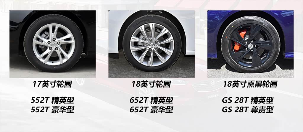 轮圈方面,552T的1.5T车型使用的是17英寸轮圈,652T用的就是18英寸了,而君威GS则使用了黑色的18英寸轮圈并且搭配红色卡钳。
