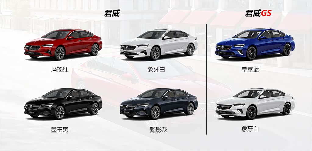 外形方面,君威跟君威GS差别还是挺明显的,车身颜色方面,君威提供了四种颜色选择,君威GS则有独有的皇室蓝和白色两种选择。
