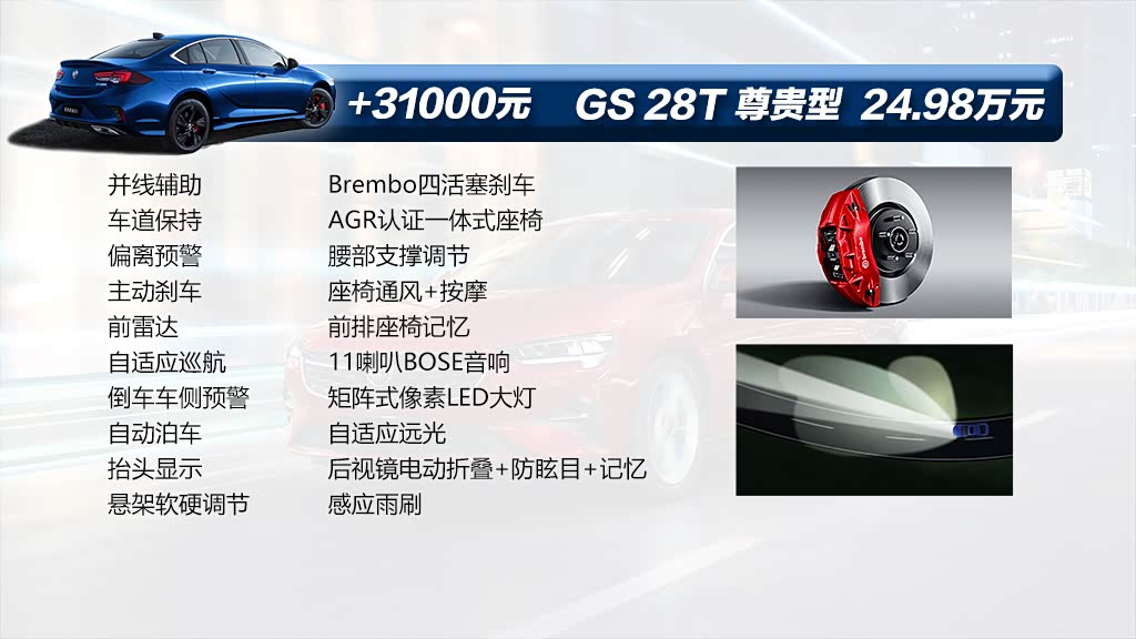 最后就是君威GS 28T尊贵型了,价格上相比28T精英型提升了3.1万元,这部分的花费主要是在硬件上给它进行了升级,包括采用的是Brembo的刹车系统和由AGR认证的一体式座椅,另外在主动安全配置上也更丰富,包括并线辅助、车道保持、主动刹车、自适应巡航等等,并且大灯也升级为矩阵式像素大灯,这款大灯是由很多发光源组成,在不同的驾驶模式下会有不同的照明效果,整体的配置表现在同级别当中也是很有竞争力的。