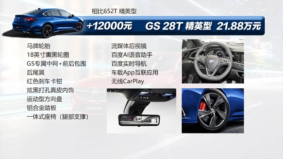 君威GS 28T精英型与652T 精英型相比贵了1.2万元,这部分差价首先是外观上的变化,不同的前后包围、轮圈。内饰部分除了配色不同之外,还使用了运动方向盘和一体式座椅。配置上增加了流媒体后视镜、无线CarPlay、导航、AI语音助手,虽然叫精英型,但是它的整体配置表现基本可以看齐652T 豪华型了,而且相比豪华型来说只贵了2000元,这部分的差价还是相当划算的。