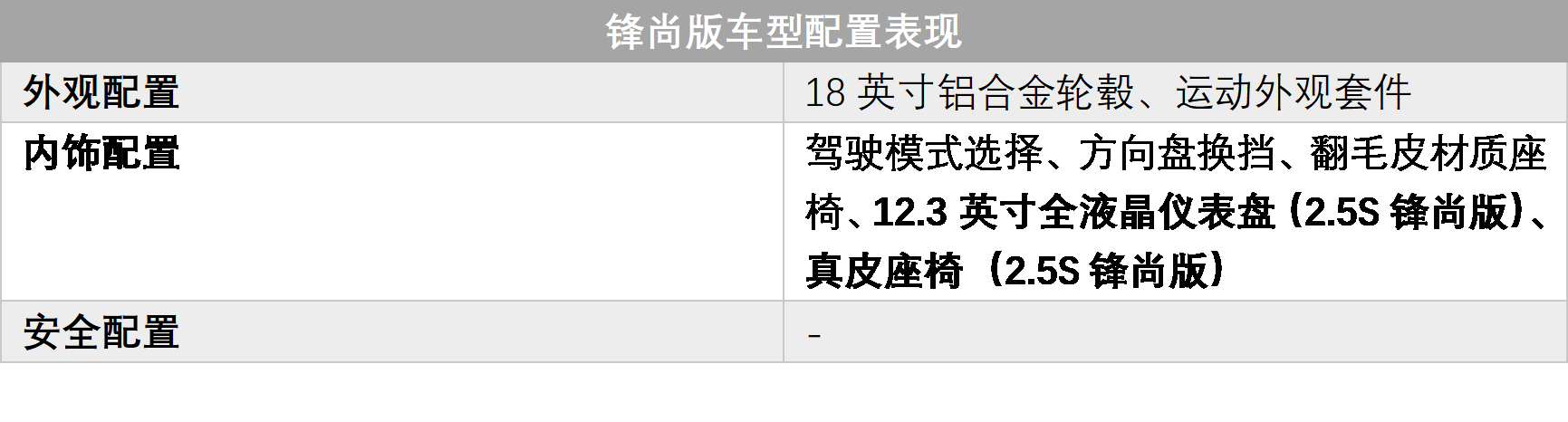 三款锋尚版车型最大的亮点是采用了运动外观套件,配置上变化不大,2.5S锋尚版和双擎2.5HS锋尚版额外配备了12.3英寸全液晶仪表盘和真皮座椅,相信会吸引到一部分追求个性化的年轻消费者。