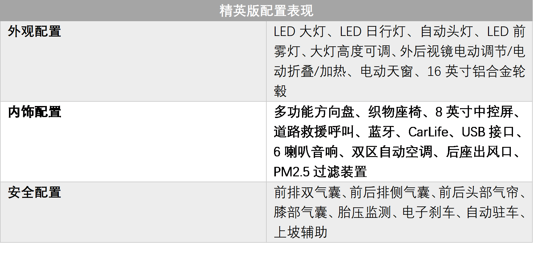 作为燃油版的入门车型,2.0E精英版的配置表现只能用常规来形容,配备的LED大灯、自动头灯、电动天窗、8英寸中控屏、双区自动空调、8气囊等都是很实用配置,但是缺乏一些亮眼的科技配置和驾驶辅助系统,适合预算有限的消费者。