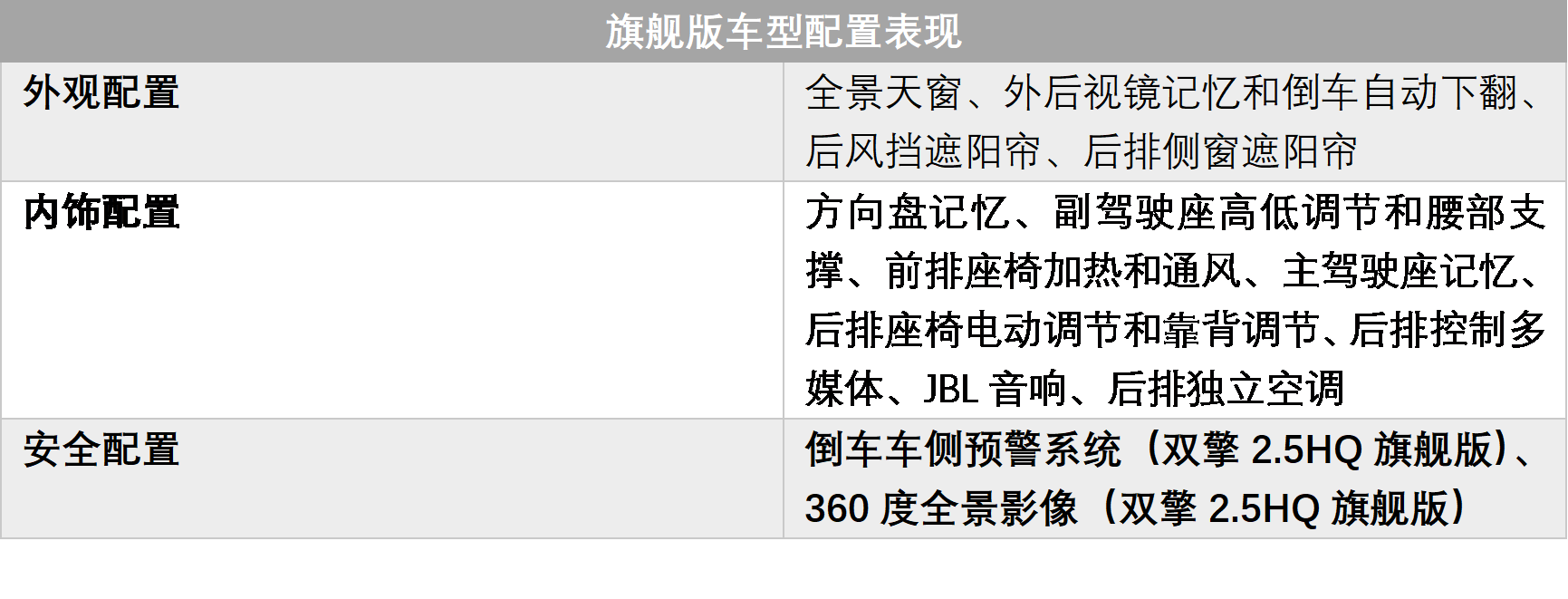 两款旗舰版车型重点升级了舒适性配置,像后风挡遮阳帘、后排侧窗遮阳帘、副驾驶座高低调节和腰部支撑、前排座椅加热和通风、主驾驶座记忆、后排座椅电动调节和靠背调节、后排控制多媒体、JBL音响、后排独立空调等,为车内乘员带来了更好的乘坐体验。双擎2.5HQ旗舰版还额外配备倒车车侧预警和360度全景影像功能。如果预算比较充足,可以直接选择顶配车型。