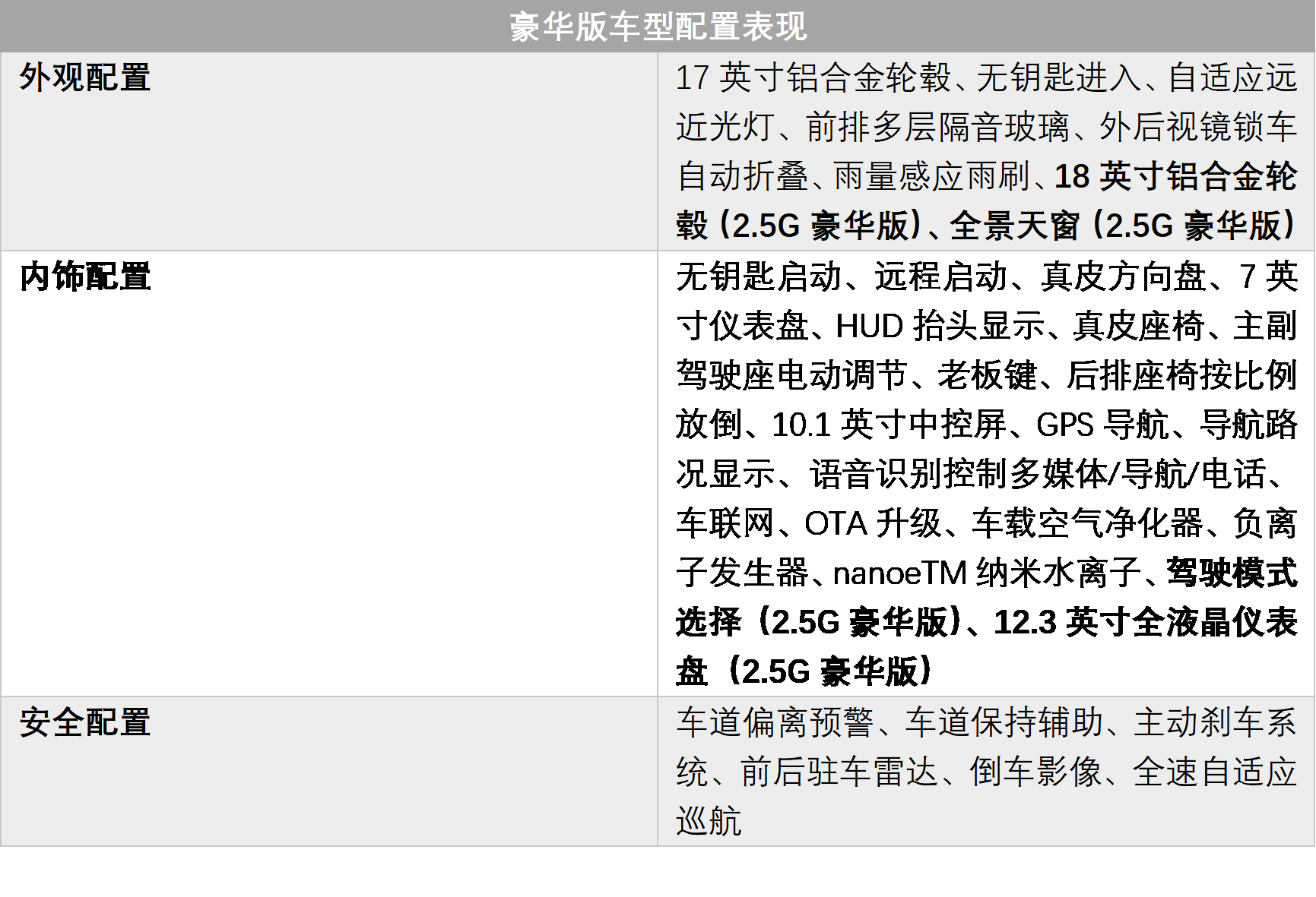 三款豪华版车型的配置表现几乎保持了一致,所以我们放在一起解读。在2.0E精英版的基础上,重点升级了真皮方向盘、7英寸仪表盘、HUD抬头显示、真皮座椅、10.1英寸中控屏、车载空气净化器、负离子发生器、nanoeTM纳米水离子、车道偏离预警、车道保持辅助、主动刹车系统、前后驻车雷达、倒车影像、全速自适应巡航等,可以说豪华版车型在舒适性、科技性和安全性方面得到全面提升。2.5G豪华版和双擎2.5HG豪华版还额外配备18英寸铝合金轮毂、全景天窗、12.3英寸全液晶仪表盘、驾驶模式选择等功能,都是消费者非常注重的几项配置。综合配置和动力表现,我们重点推荐2.5G豪华版车型。