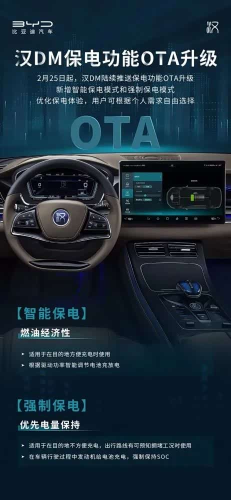 比亚迪汉DM新增保电功能,即日起通过OTA功能陆续推送;