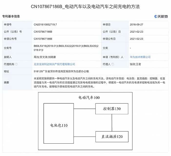 华为公开汽车互充专利,汽车与汽车之间可以相互充电;