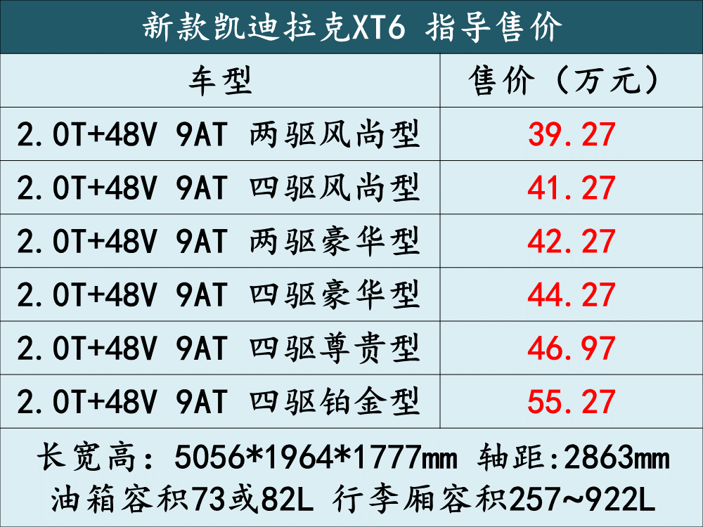 XT6也推出了6款车型,定位于中大型SUV,售价区间39.27~55.27万元,相比XT5在长度上提升明显,轴距提升不明显。