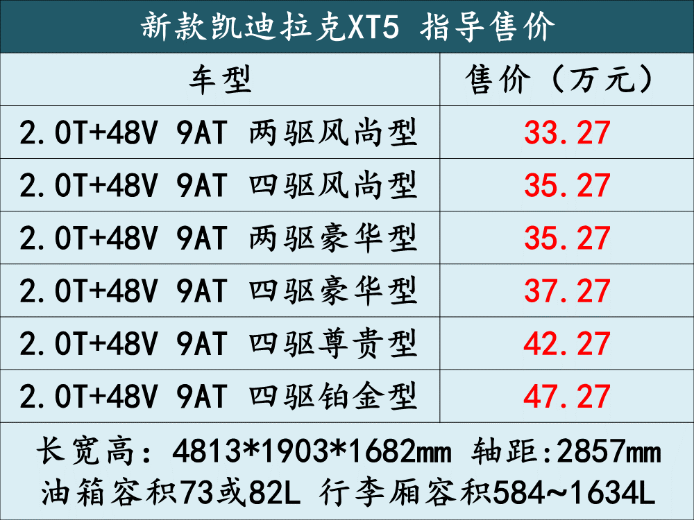 XT5共推出六款车型,定位中型SUV,售价区间33.27~47.27万元。