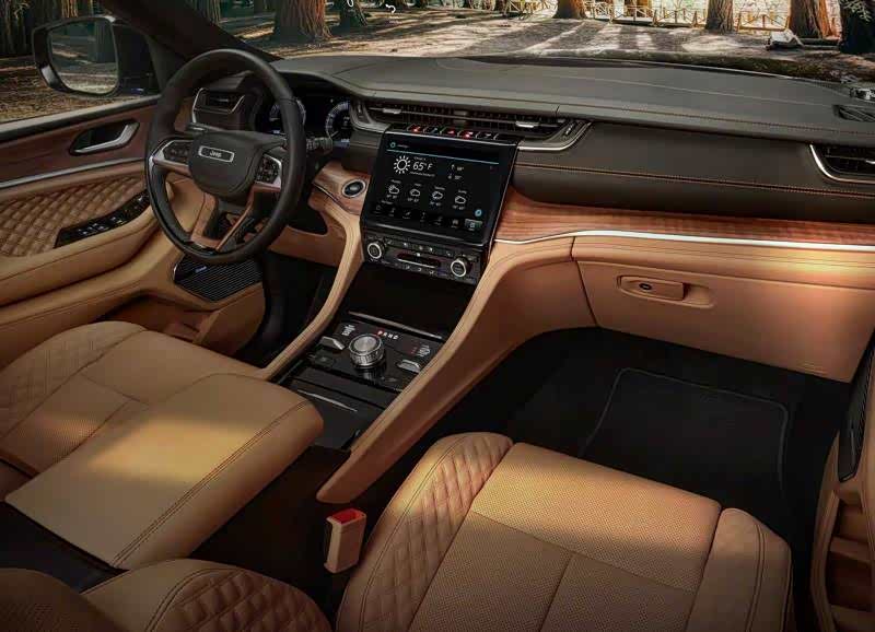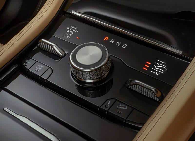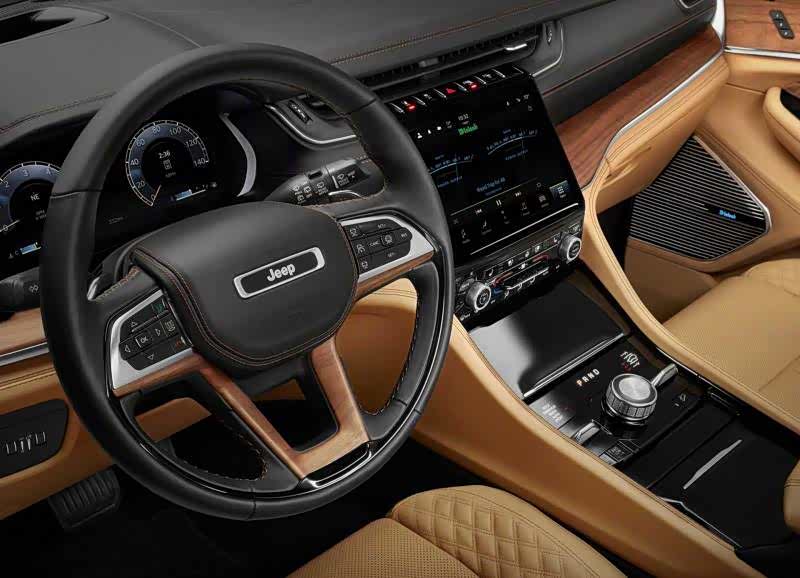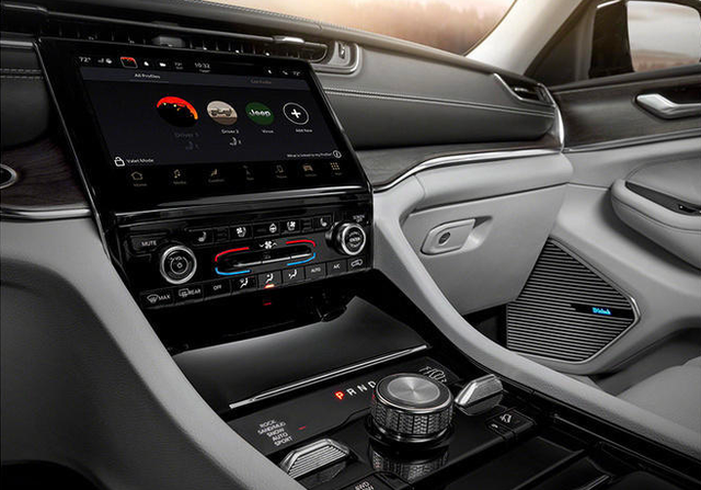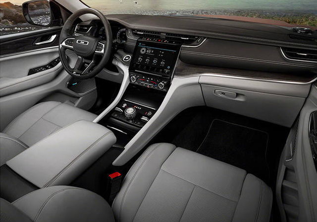 内饰方面,可以说全新的Grand Cherokee L发生了翻天覆地的变化,新车配备了全新的10.3英寸全液晶仪表盘,方向盘则用了造型比较新颖的三幅式方向盘,新车的中控大屏尺寸为8.4英寸,同时还可提供10.1寸的大屏作为选装。全新Jeep Grand Cherokee L内饰的材质也很有档次感,内饰颜色分别有黑白和棕黑可选,贯穿式的镀铬条装饰和双缝线的加入让中控台精致感十足。此外新车还采用了旋钮式的换挡杆,两侧采用了拨片式的驾驶模式切换系统,整体运动感十足。