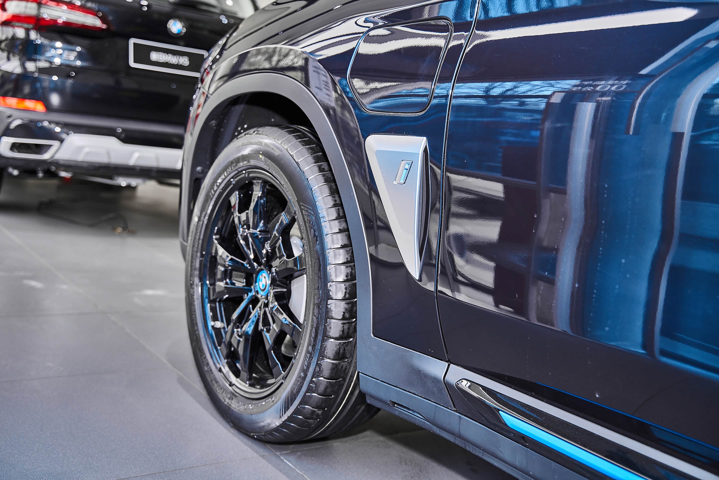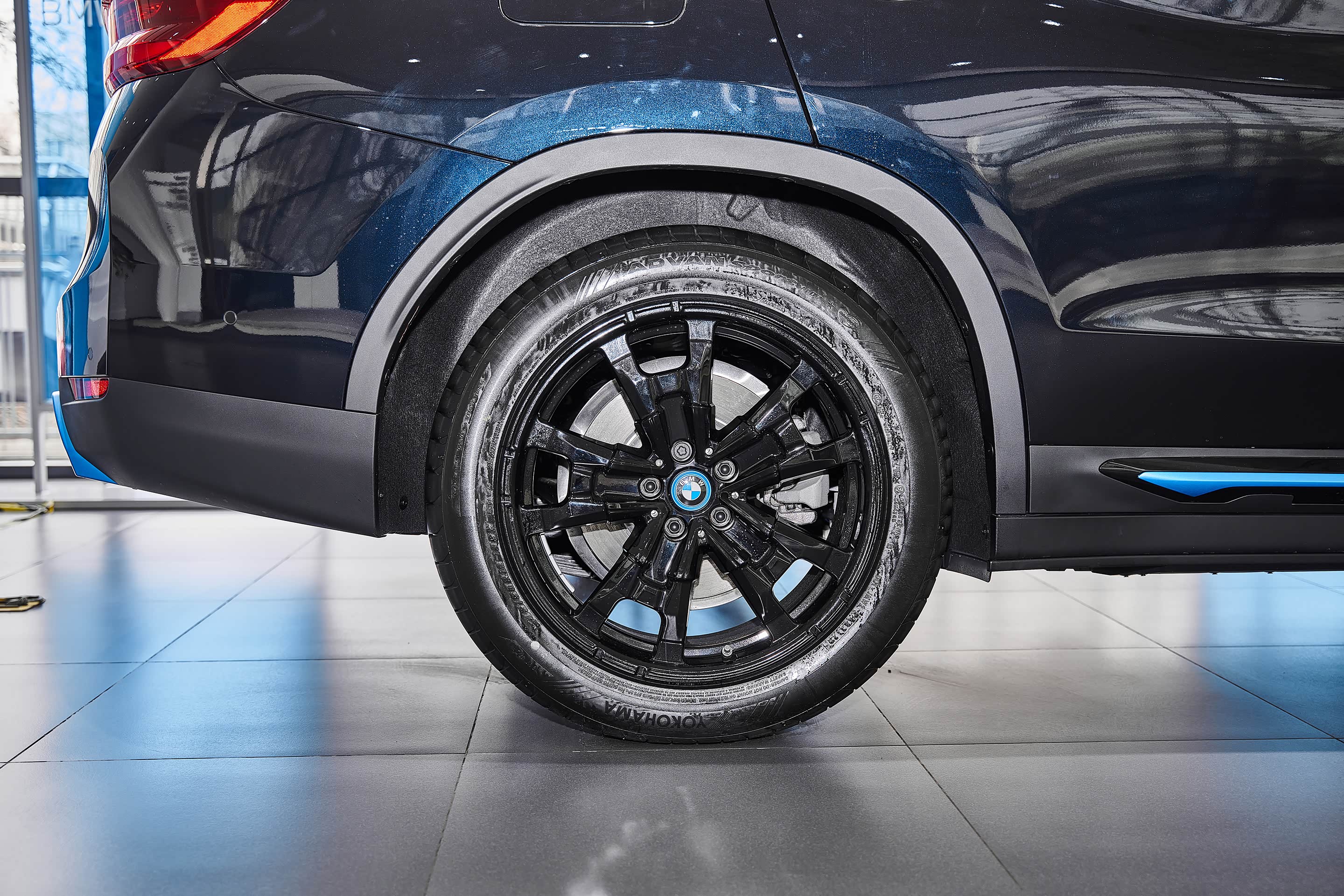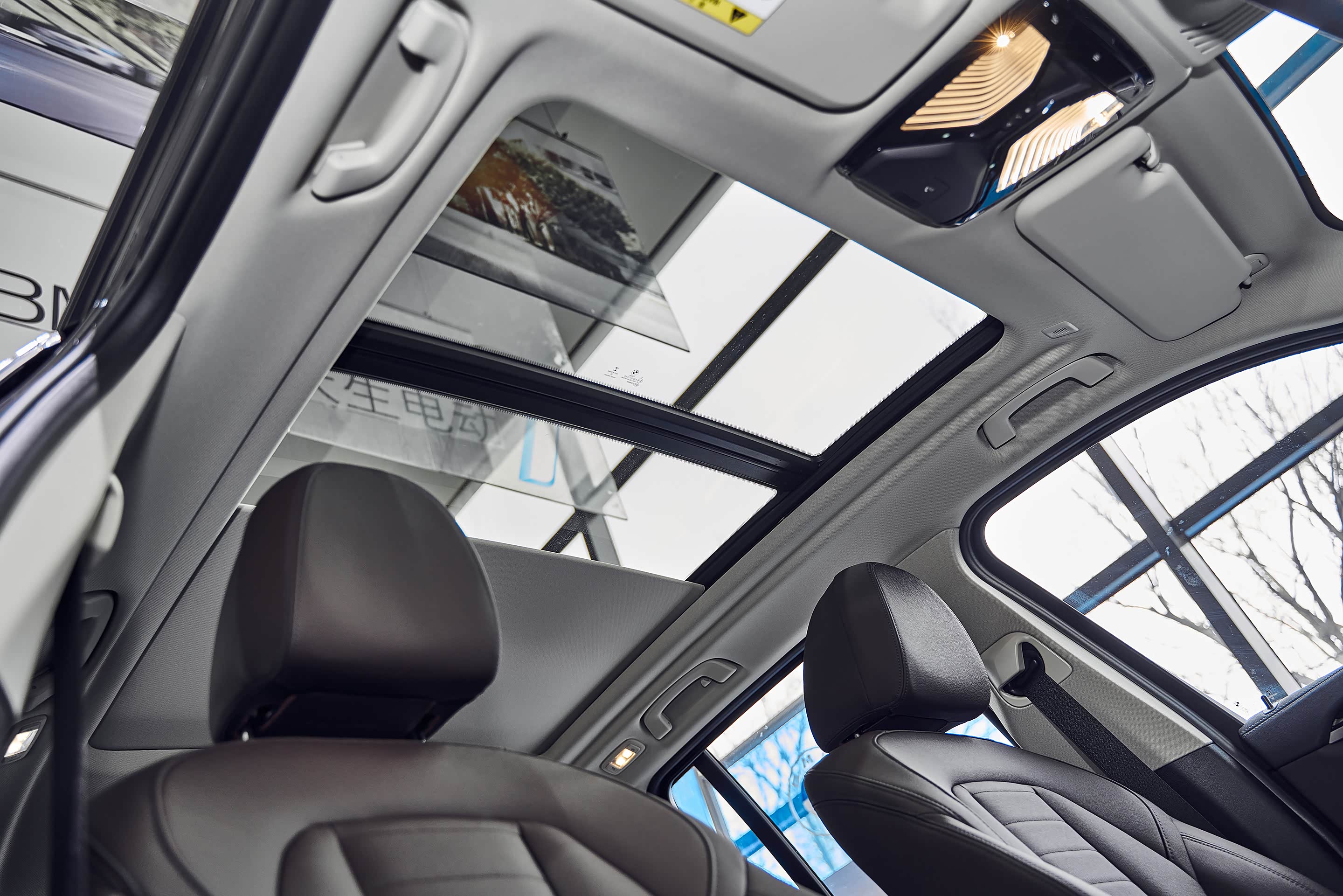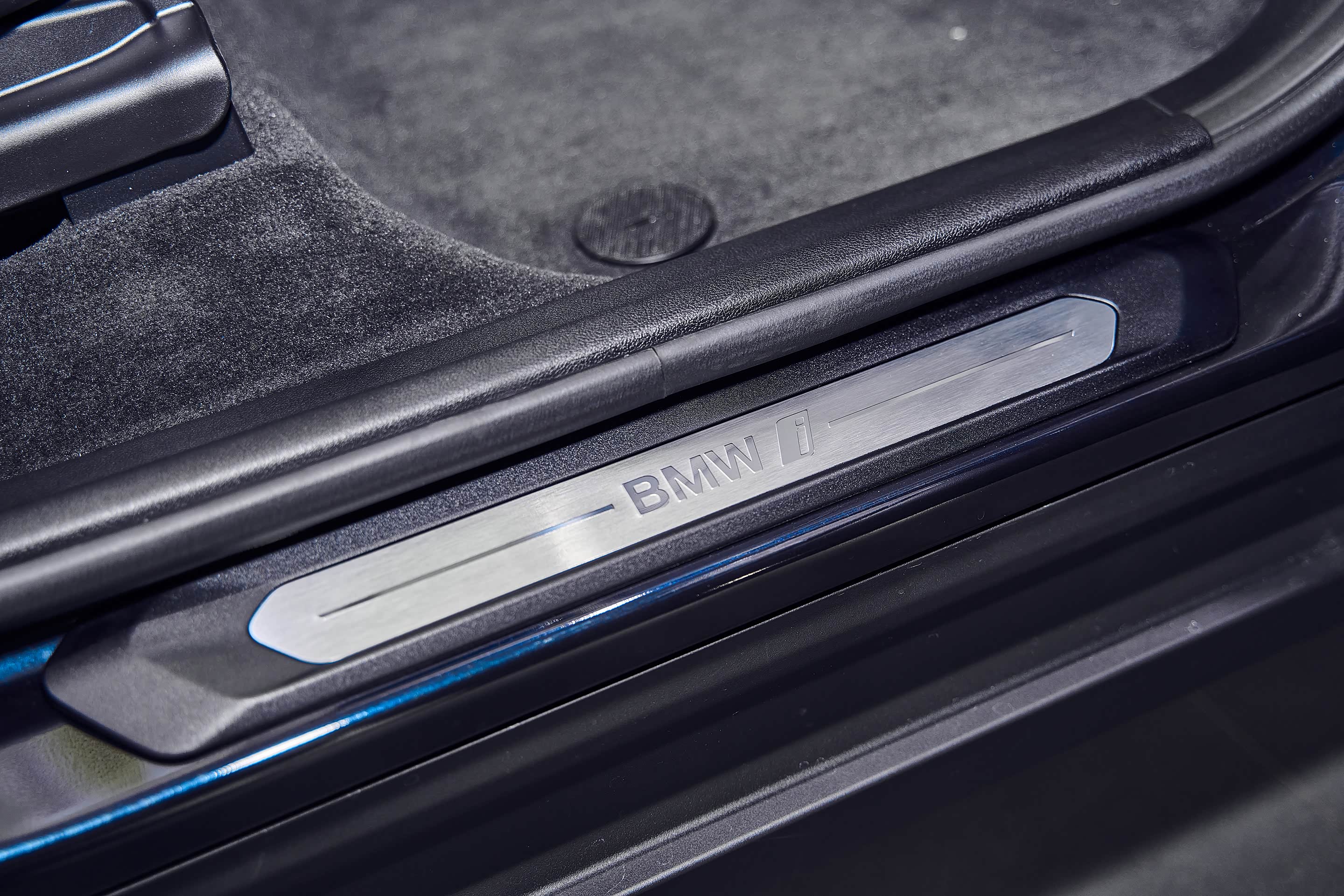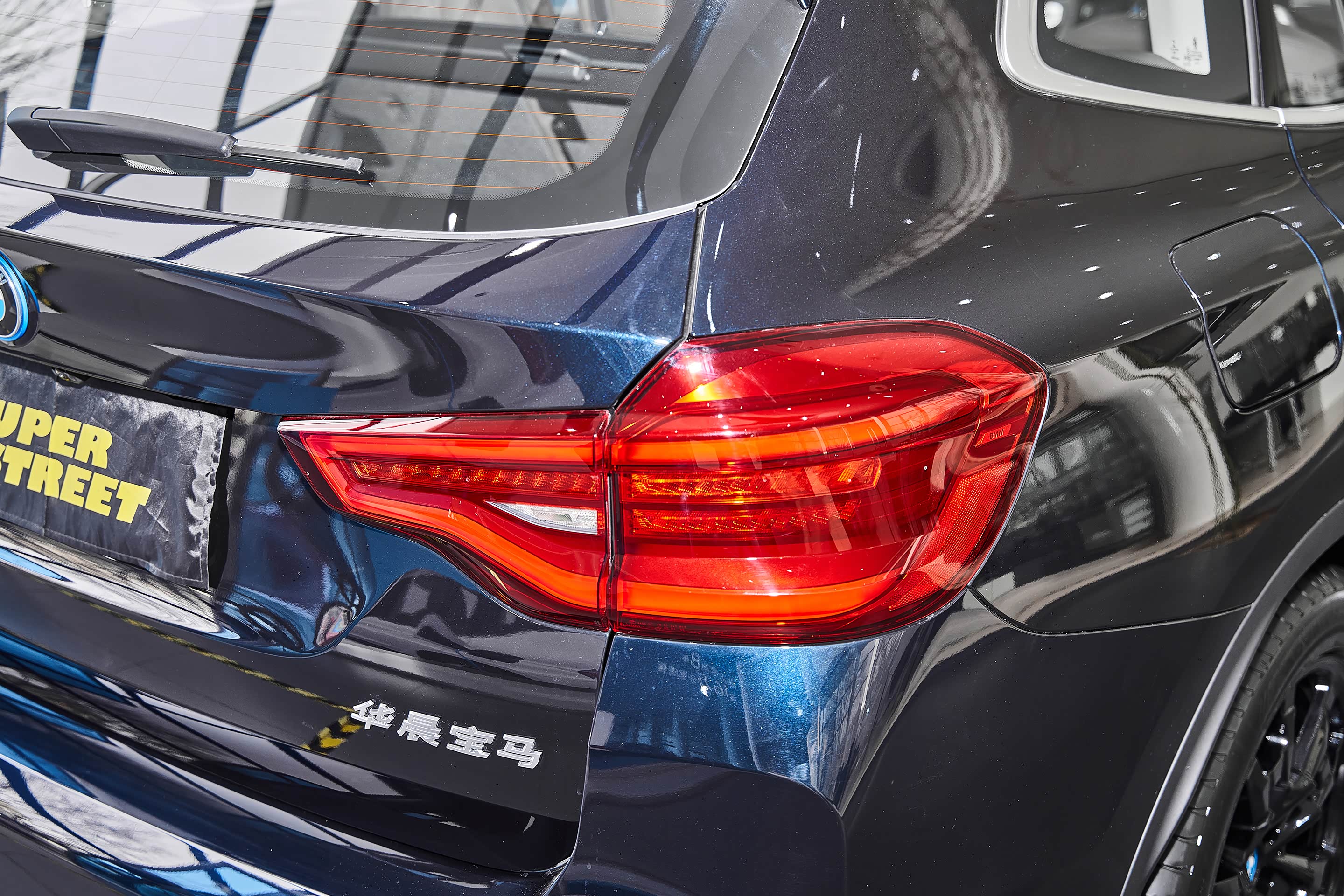 车辆后部由于是电动车,没有排气尾口,特意设计的浅蓝色装饰板,稍有些突兀,可以起到空气动力的作用。如果你嫌电动车太安静,那么创领型还配备了BMW电动车声浪模拟。