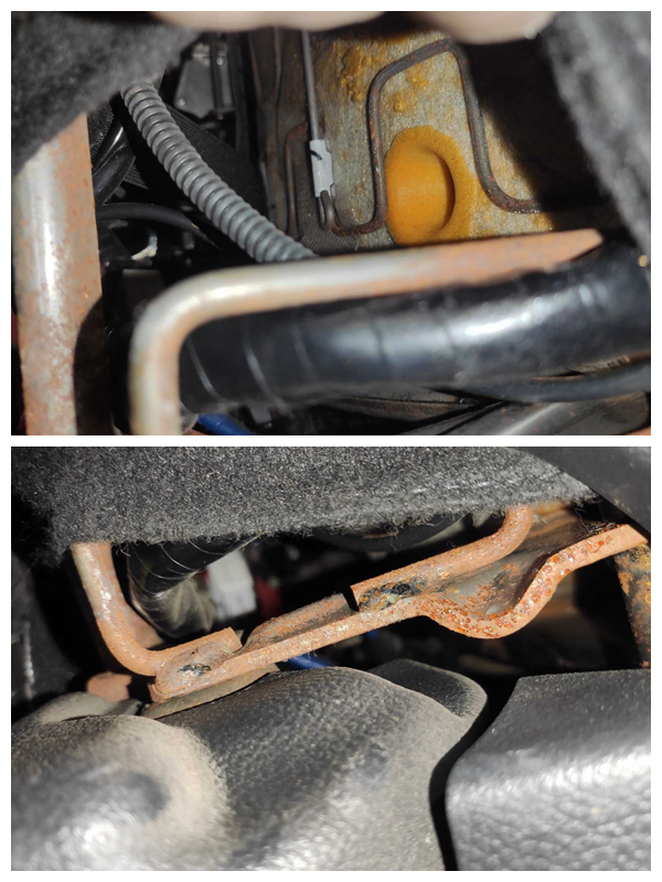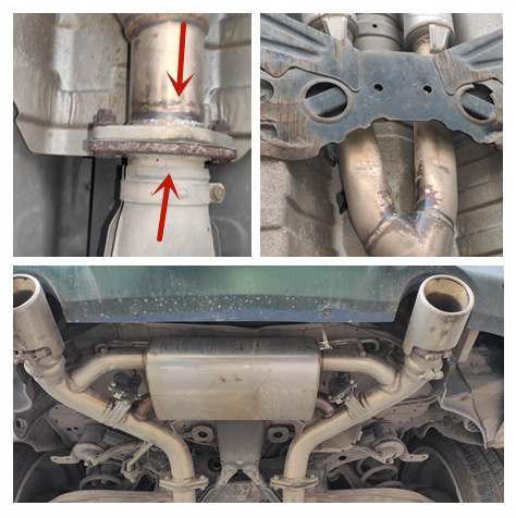 后部排气管尾节有改装更换,前后明显的新旧成色对比,都不用看螺丝有没有拆卸特征。另外排气管下部托架还是有轻微托底的情况,不过也还好,不影响正常使用。说明车子平时行驶的路况不错,要知道大锤可见过G37硬生生把纵梁托底托变形的。