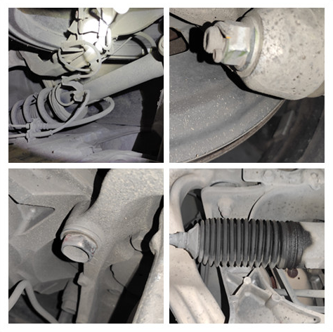 检测底盘我们就从悬挂看起,左右两侧悬架各部分完好,整体性也不错,只有方向机两侧的防尘套有轻微漏油。这种现象在日系车上比较常见,也不用担心,后期注意使用观察就行,必要时更换防尘套即可。