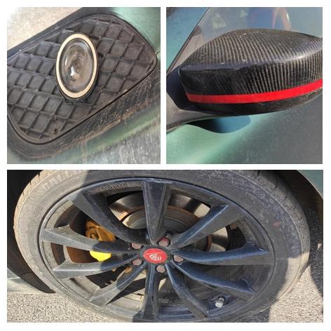 外观上一看就知道有多处改装,车身贴了改色膜,加装前雾灯,喷涂刹车卡钳,轮毂外侧喷漆改色。车主说年轻的时候爱折腾,现在当了父亲,工作又变的很忙,才想把这车卖掉。