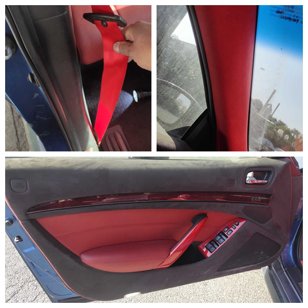 内饰虽然看着热情奔放,但是经大锤鉴别,局部地方都是后期改装的。门板翻毛皮,仪表台翻毛皮,A柱饰板,中网扶手,包括安全带等等。这些改装不是什么大问题,但是后期可能会有异响,毕竟拆了那么多零部件,组装工艺不像原厂精密,如果安装不到位出现松旷异响也是非常常见的。