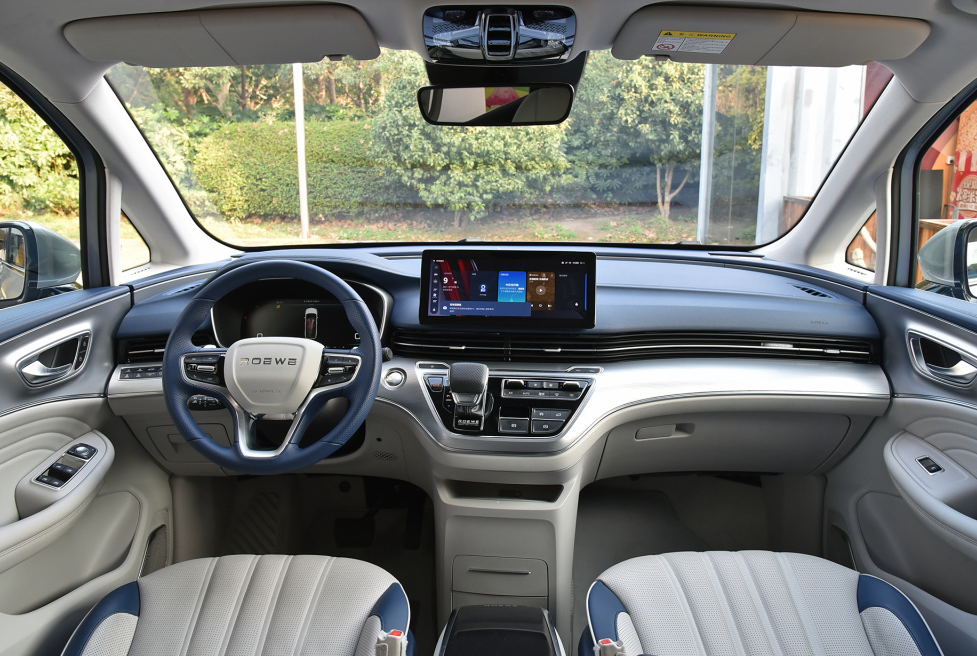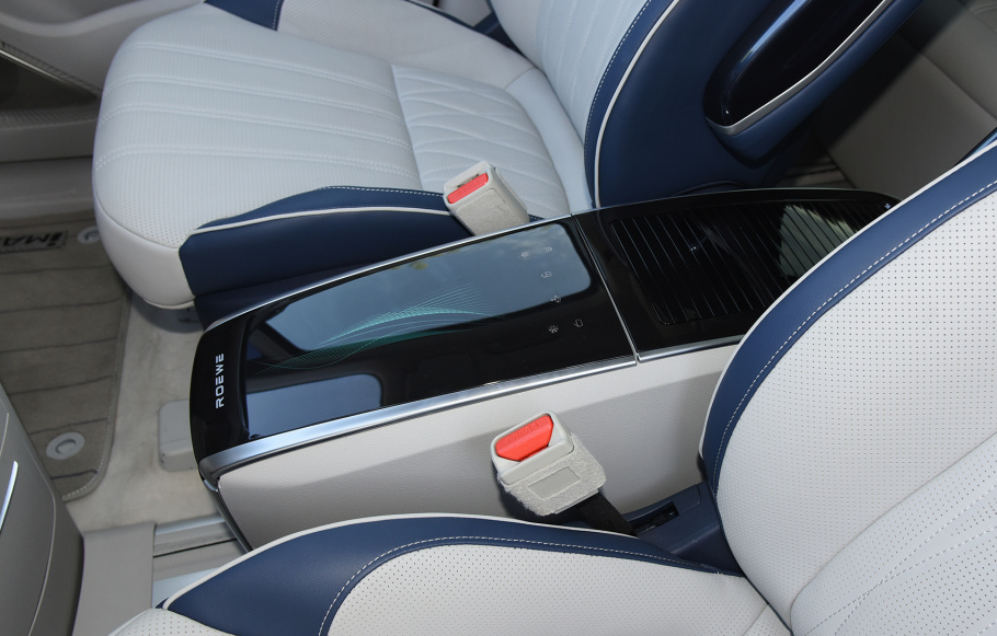 荣威iMAX8的内饰基本上保持一个风格;三幅式多功能方向盘采用了真皮材质包裹,并且具有四向手动调节、换挡拨片等标准配置;中控台面板采用金属拉丝工艺材料;全液晶仪表和中控屏可以实现双屏互动。荣威iMAX8上的两个老板椅集成了电子腿托、电动腰托,以及可调节的头枕,并支持加热通风功能。此外,该车还有A柱盲区显示,可以有效杜绝盲区意外情况的发生。