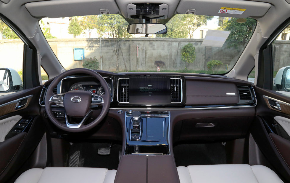 传祺M8对内饰设计进行了彻底的升级;中控台虽然仍采用轿车化的“T”形设计,但宽度变窄且与中央扶手相连的鞍部设计让中控显得更具整体感;小巧的电子档杆以及光滑整洁的大块钢琴漆饰板让内饰看起来更加简洁。液晶仪表与中控触摸屏虽然没有采用与Aion系列车型相同的双联屏设计,但也通过一块钢琴漆面板整合起来,旧款车型中控凌乱的不足在新车身上得到明显改善。