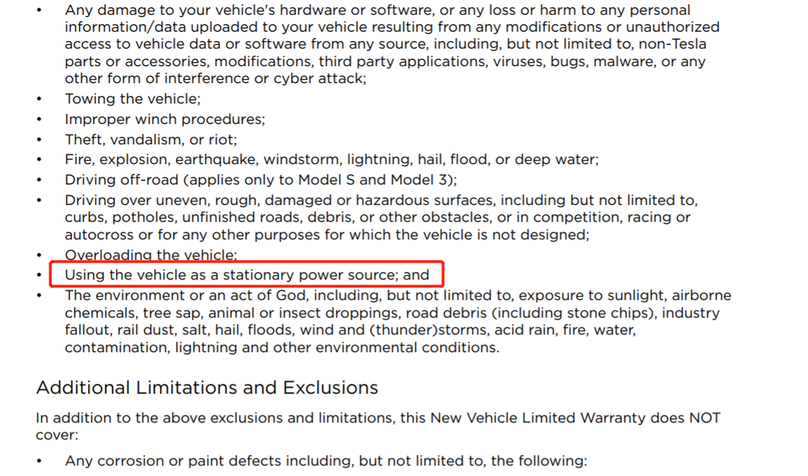 原来,特斯拉从社交媒体上看到了车主发布的反向供电的消息,认为他违反了特斯拉的质保政策,随后该车主的车辆系统提示他需要更换12V电池,而当他去到官方维修服务中心更换12V电池的时候,特斯拉工作人员告诉他车辆已经弃保了,因为特斯拉的质保政策里面明确约定,不能将车辆当成电源输出工具来使用。