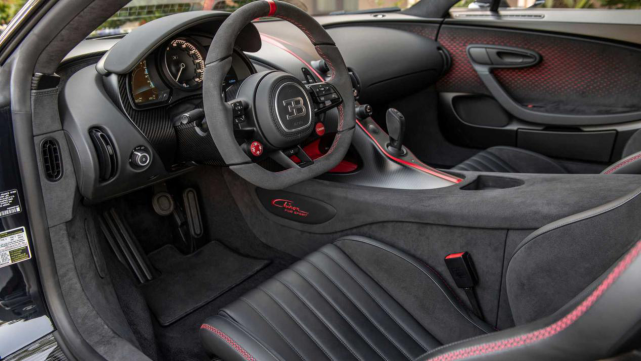 进入车内,是布加迪独有的C型座舱,中控台区域使用了大量的碳纤维材质,除此之外几乎所有装饰区域都使用特质的铝或钛合金材料,能最大化的减轻重量,且不影响抓地力。
