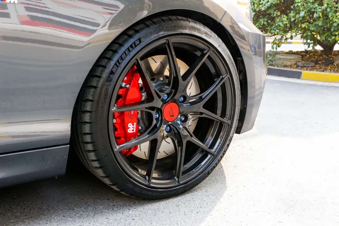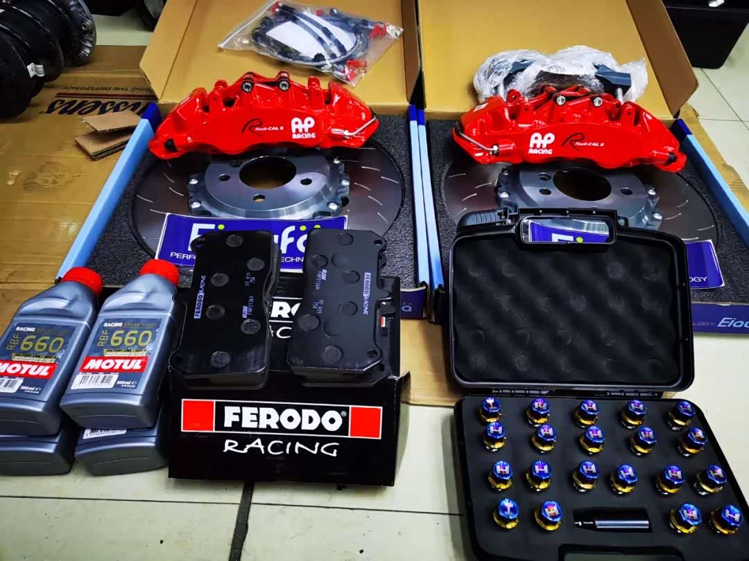 轮毂内部是来自AP-Racing的一对前六活塞卡钳-CP9560 大红色,搭配FerodoSD2500刹车片、Goodridge刹车钢喉、Eiaufa FR系列短线竞技刹车盘、定制的合头桥码,刹车性能足够应对日常驾驶了。下一步的计划就是程序刷一介,外加一套Supersprint中尾段排气,再来一条碳纤维前唇,在我内心这样应该就完美了。