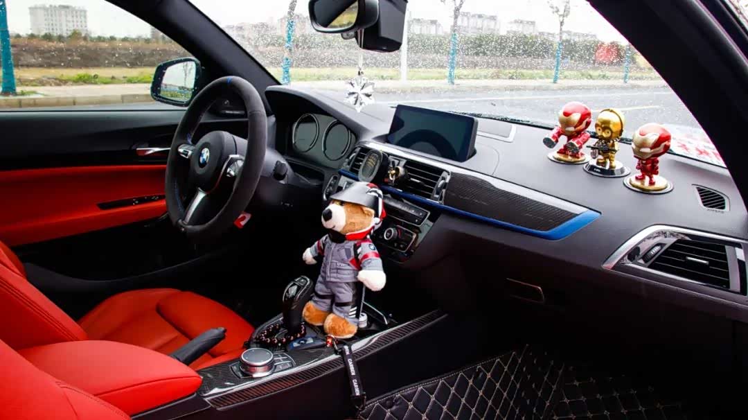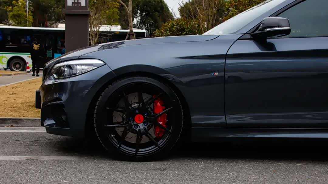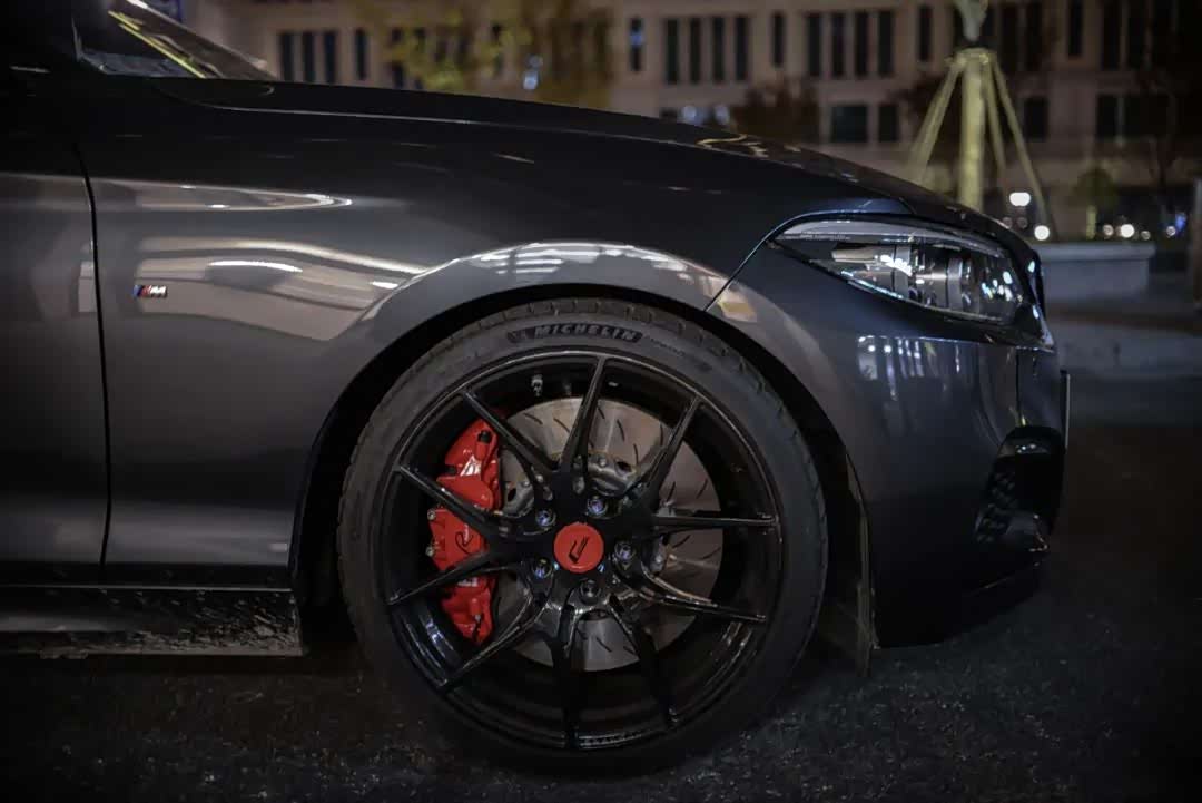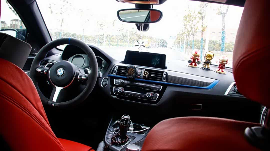 外观部分,前脸是M performance样式,配合着尾部的M performance碳纤尾翼,前后呼应,在KW ST XA避震器的帮助下,车身高度降低了,整体看上去运动气息更强了。侧面的轮圈早已不是原厂的配置,换上了一套更具视觉张力的多幅式运动轮圈,Choosebes R5X黑金款锻造轮毂前后数据分别为19x8J和19x9J,而ET值则分别是40和48,匹配的米其林PS4S轮胎规格为前235/35/19、后255/30/19,十足的运动感。同时还来了一套HEGEMONY钛合金防盗螺栓,幻彩蓝的点缀,让这辆小灰颜值倍增。