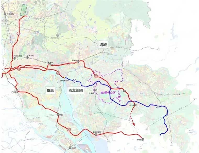 东莞市轨道交通局对广州22号线延伸至东莞滨海湾新区做了回应。根据规划,广州地铁22号线自广州南沙客运港引出,与中南虎城际互通,然后下穿狮子洋,接入东莞滨海湾新区,然后向东延伸经深圳松岗站止于光明城站,延伸段长约40.8km,共设3站,其中广州段长约2.8km、东莞段长约19.3km、深圳段长约18.7km;延伸后线路全长约148.8km(白云机场-光明城)。