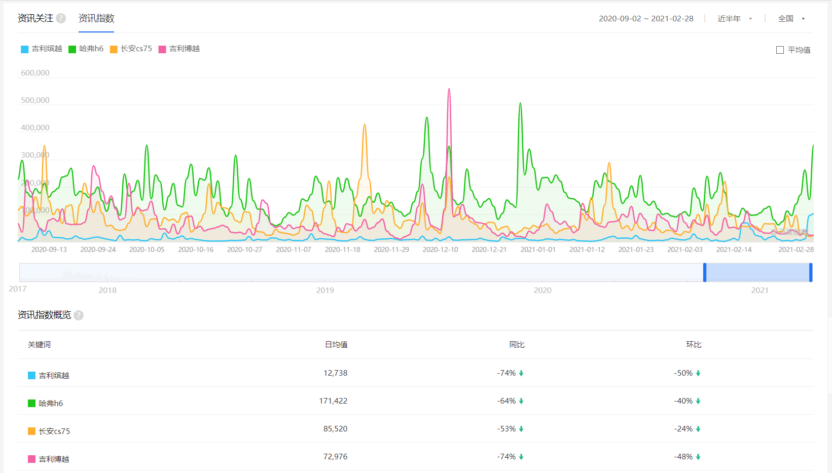 吉利缤越,这款车在国内的热度并不高。在百度的搜热度中,缤越这款车的资讯热度和搜索指数只有热门车型的十分之一甚至更低。在2020年终,吉利缤越这款车全年卖出了124456辆,排在中国SUV销量榜中的22名,也就是说,在一般的月度销量TOP 10、年度销量TOP 10的盘点中,你很难看到缤越的身影。