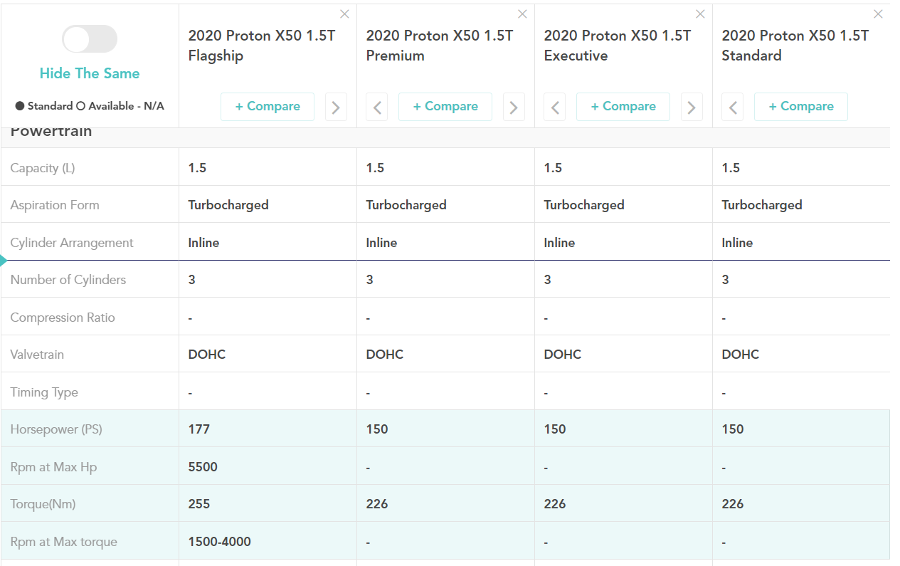 Proton X50则全部采用1.5T三缸涡轮增压发动机,但是先别急着说外国月亮圆一点,Proton X50有四个配置,其中三个都是采用1.5T的歧管多点喷射技术的低功率发动机,最大马力只有150匹,而只有卖到10.33万马币(16.49万人民币)的顶配车型才配备177匹的顶级动力。在中国,你只需要最低9.98万元就能卖到177匹的吉利缤越。