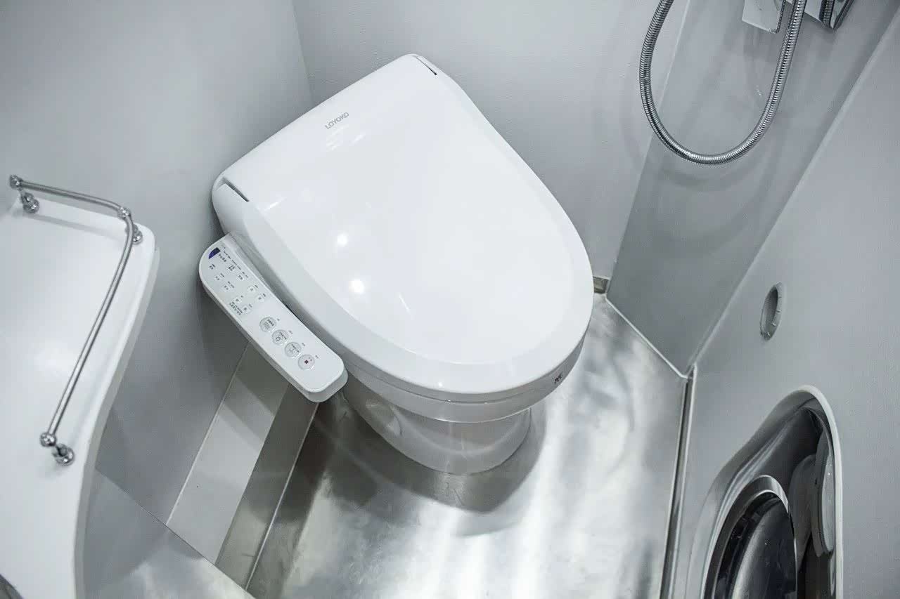 卫浴间设计在车尾的另一侧,内部空间宽敞,配备齐全,配有智能马桶、洗手池、淋浴系统、穿衣镜、储物柜等基本配置。