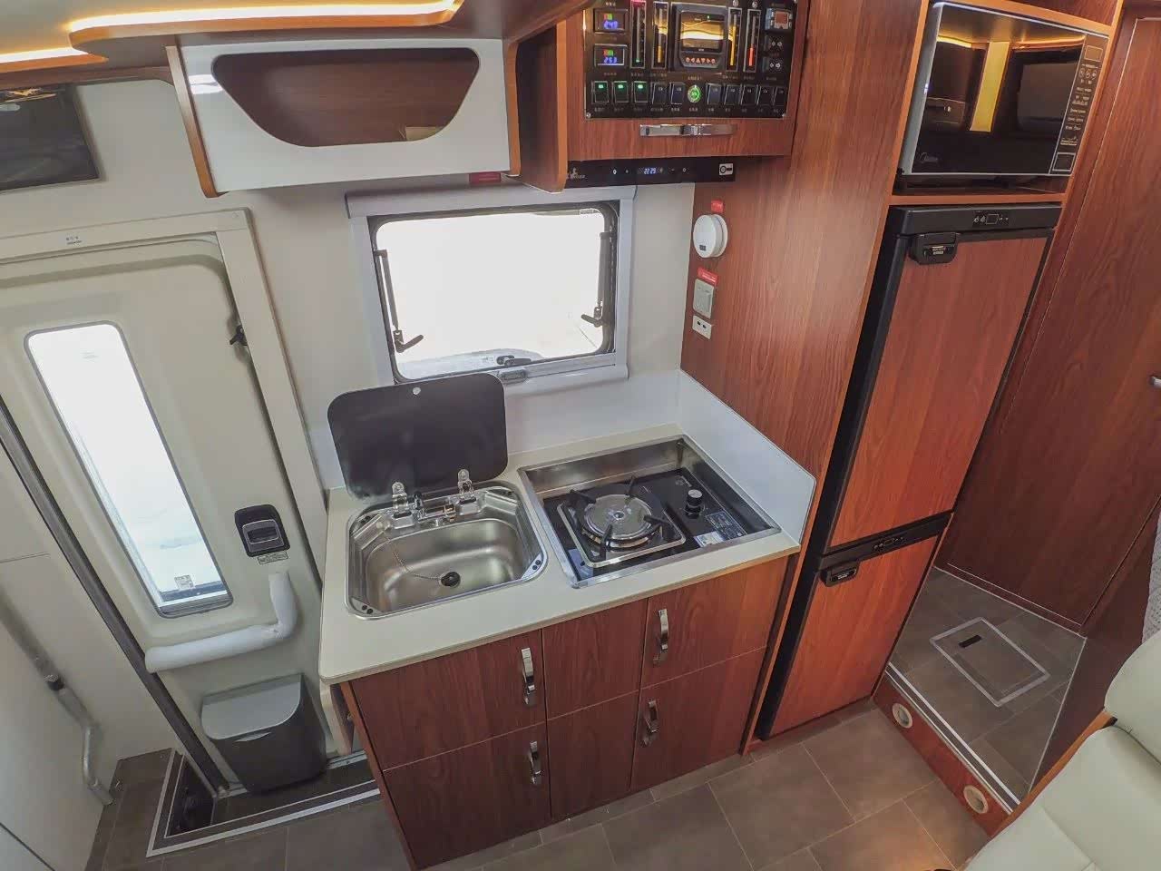 会客区的对面是厨房区域,配置有微波炉、抽油烟机、洗菜池、电磁炉、燃气灶等设备,在厨台的旁侧还配置有一台容积为152L的电冰箱,具备冷冻和冷藏两种功能,行车路上保障食物的新鲜。