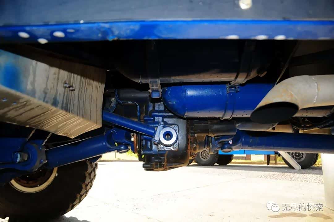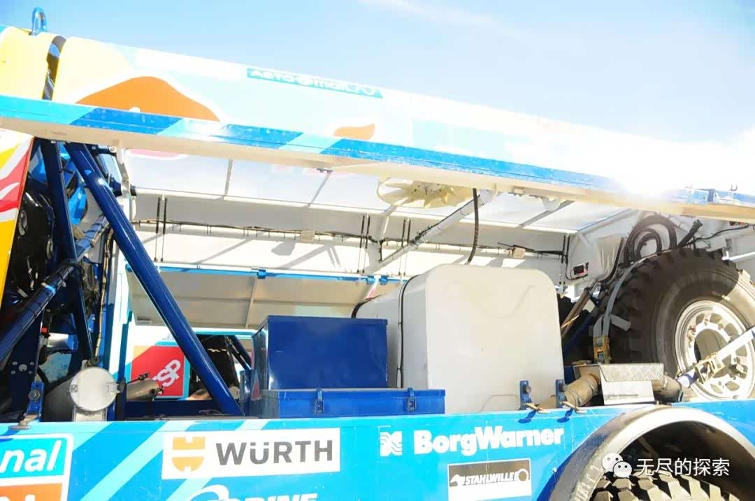 卡车组的赛车在大梁之上基本上没有什么重的东西,我们通常看到的就只是一个空的外壳,另外备胎是挂在大梁上的,也是尽量的低,这个也是没办法,它的备胎实在太大了, dakar 达喀尔的卡车轮胎一般都是14.00的,就是所谓的北约战术卡车轮胎,直径在1米4左右吧。另外有些做 T4 服务的卡车上也会带它服务的汽车组赛车的备胎,比如卡玛斯的后勤车就带过标致的备胎;因为标致是两驱两驱的赛车,它的 37 吋胎太大了,自己只能带两条,在很多艰苦的赛段里两条备胎是不够的,很多四驱组的赛车三条备胎都不够。