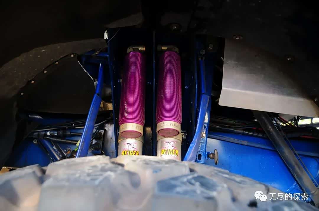 卡车的悬挂形式和我们普通的货车是一样的,基本都是前后硬桥加钢板,也有少数独立悬架的卡车赛车,比如荷兰的GINAF,还有捷克的太脱拉用半独立,但是成绩都不太好,只是偶尔昙花一现表现一下。dakar 卡车的这种钢板都是变截面的,行程都会比较大,另外卡车上装的减震器也是比较昂贵的,像卡玛斯、依维柯装的都是REIGER雷格尔的减震器,都是双减震,这对于控制卡车的大行程也是有非常重要的作用。