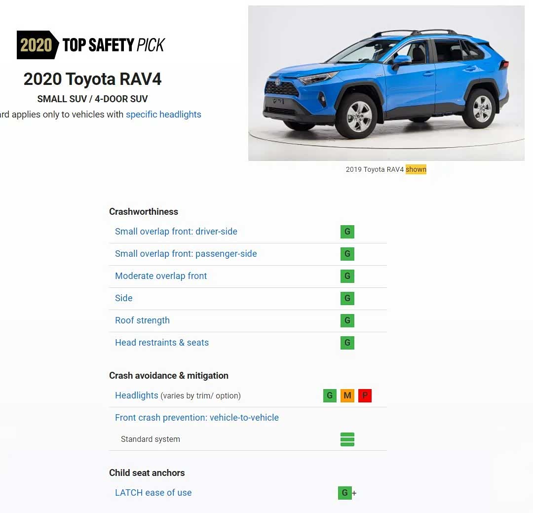 IIHS采用的测试车型是2019款RAV4,测试成绩如下图所示: