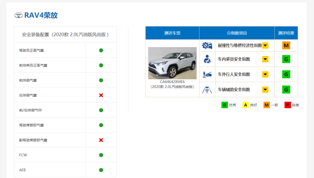 而中保研C-IASI方面,测试车型为2020款 2.0L风尚版,成绩如下图所示: