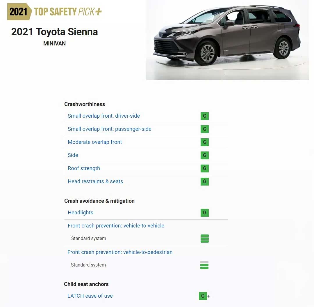这次2021款塞纳在IIHS的碰撞测试,官方给出了全「G」的评价,具体的成绩请看下图: