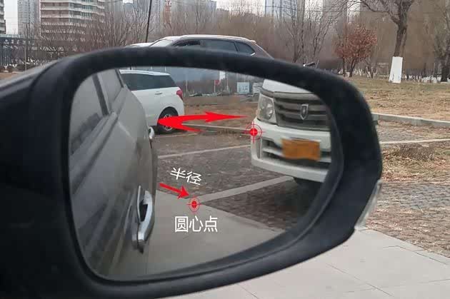 上图就是镜子里面看到的效果,这是倒车的最佳半径。接下来,挂上倒挡,同时先把方向回正。下一步就是边走边打轮,眼睛盯着后视镜,以库角或者车灯为圆心点,让后轮围着库角旋转,或者让后门把手围着圆心点车灯旋转,边走边调整方向。